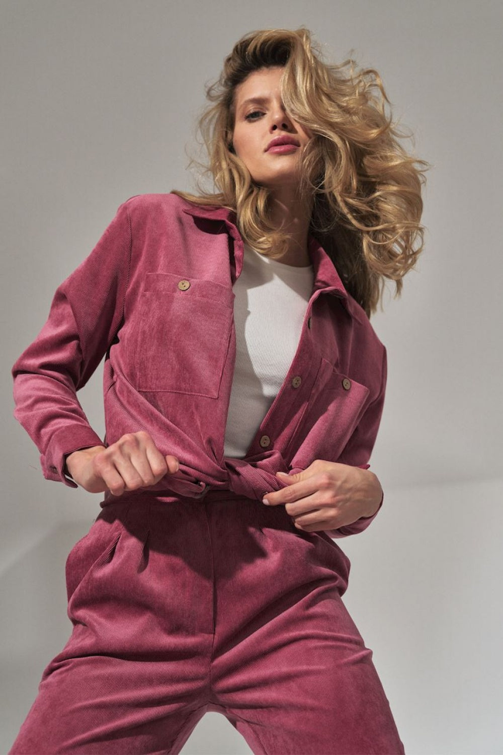 Camisa clásica de pana rosa con cuello. Manga larga rematada con puño con botón. Grandes bolsillos decorativos cosidos en la línea del busto. Tapeta con botones.