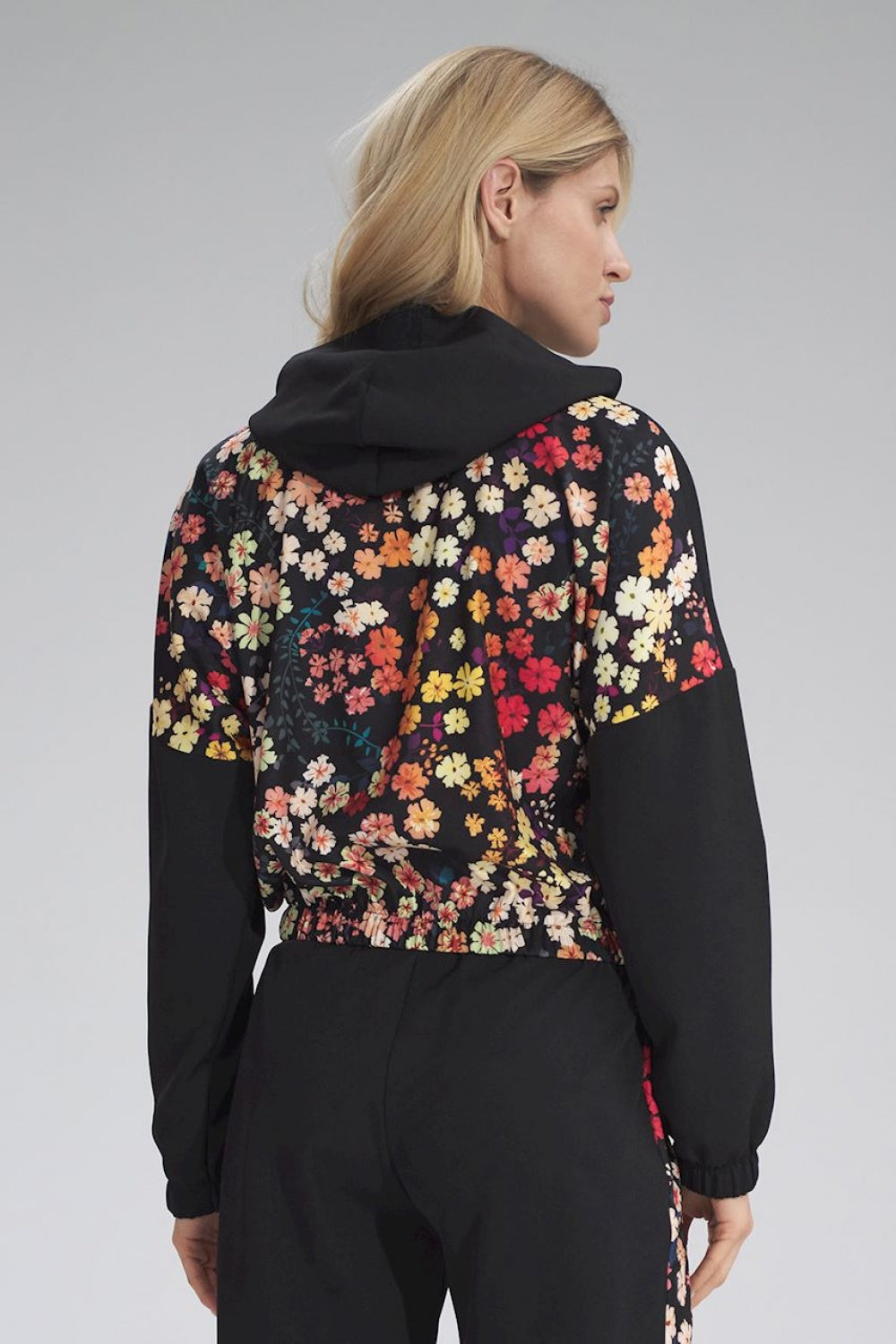 Sudadera corta bicolor con estampado de rayas en el busto, mangas y bajo rematada con una amplia banda elástica.