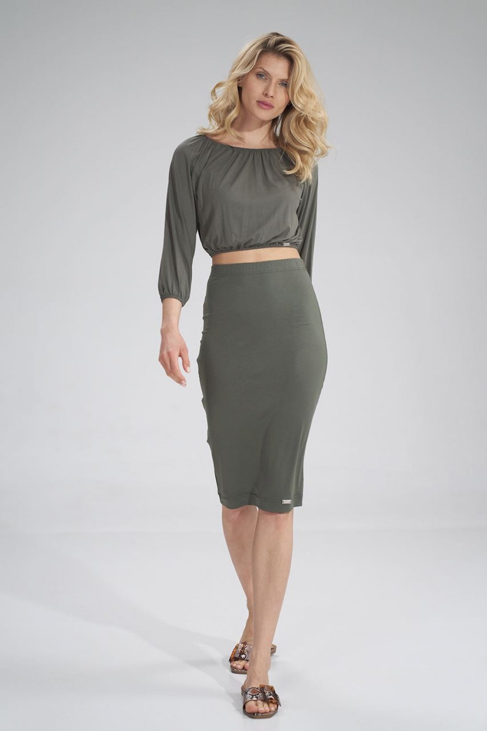 Blusa corta con mangas 3/4, escote, mangas y bajo plisados, rematada con banda elástica cosida.