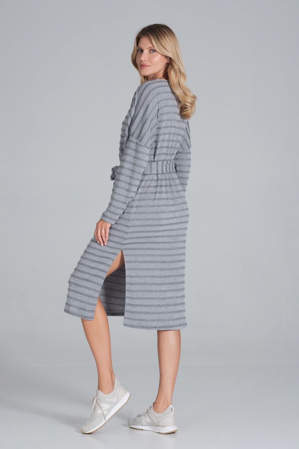 Vestido midi cálido de invierno, escote semicircular, manga larga y corte recto. Se ata a la cintura y tiene aberturas laterales.
