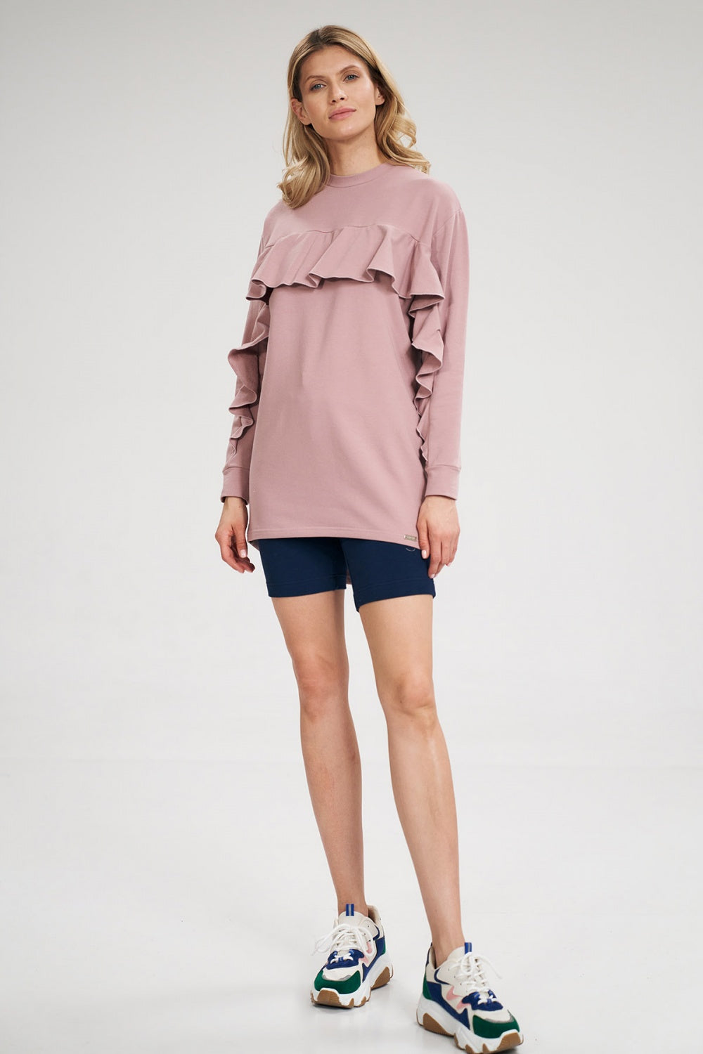 Túnica sencilla de algodón, de manga larga y decorada con un volante que sobresale del busto. Escote. Espalda semicircular más larga.