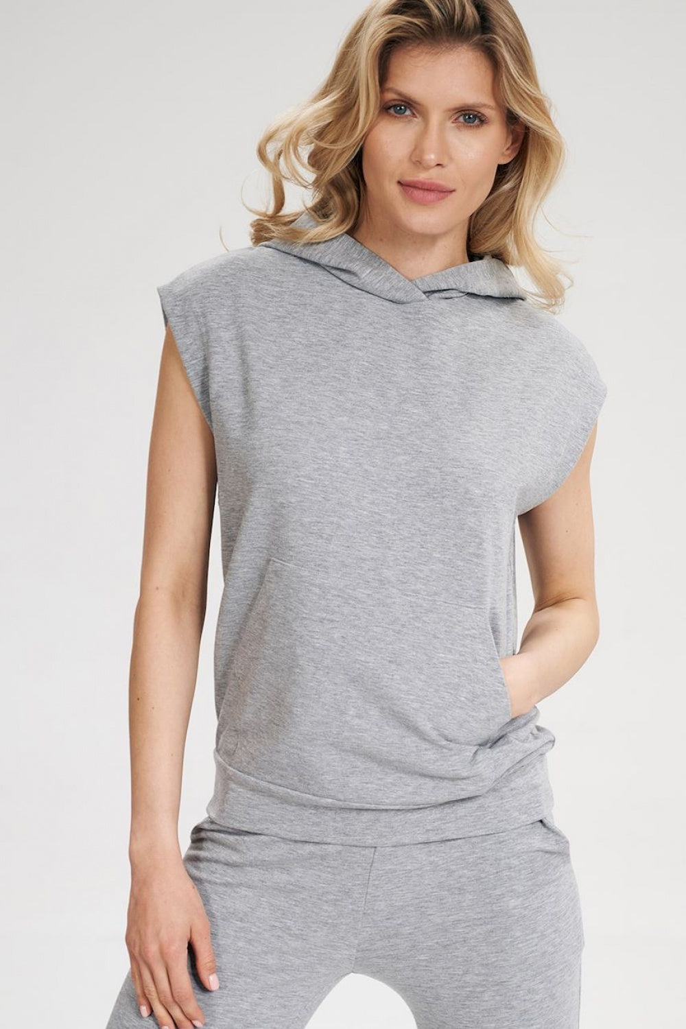 Sudadera de algodón sin mangas con capucha y un gran bolsillo cosido en la parte delantera. Sudadera de corte holgado.