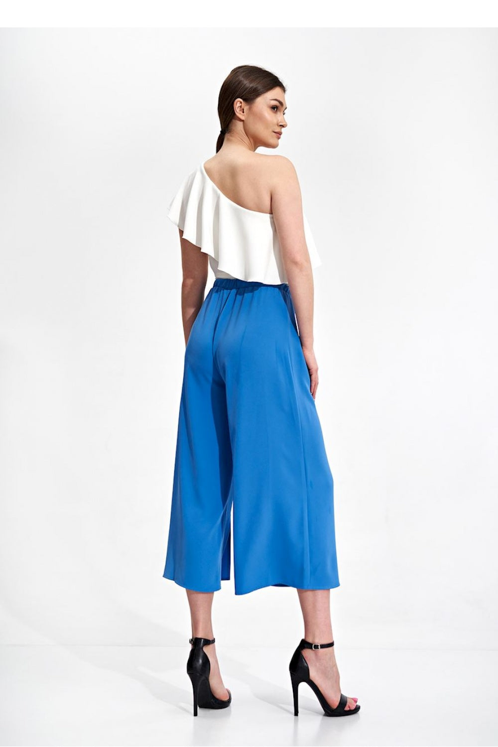 Pantalón acampanado 7/8, con abertura decorativa en la parte delantera del bajo de la pierna. Cinturilla con banda elástica cosida con ribete decorativo. Sin bolsillos ni cierre.