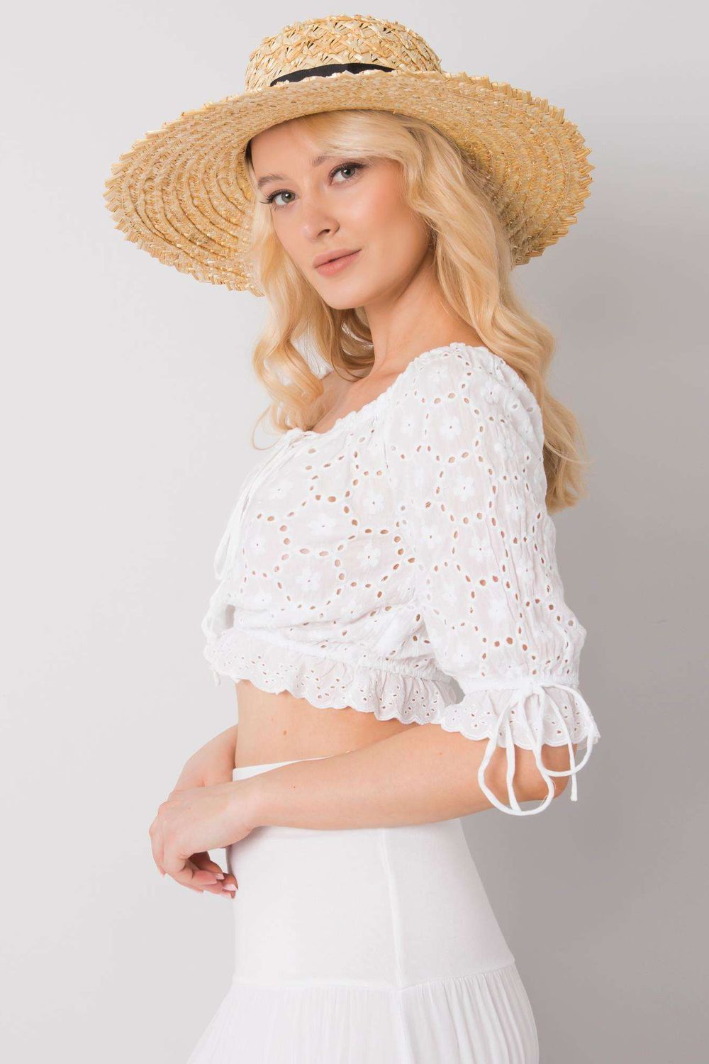 Una interesante blusa de manga corta confeccionada en tela con estampado calado. Se ata al frente y en las mangas.
