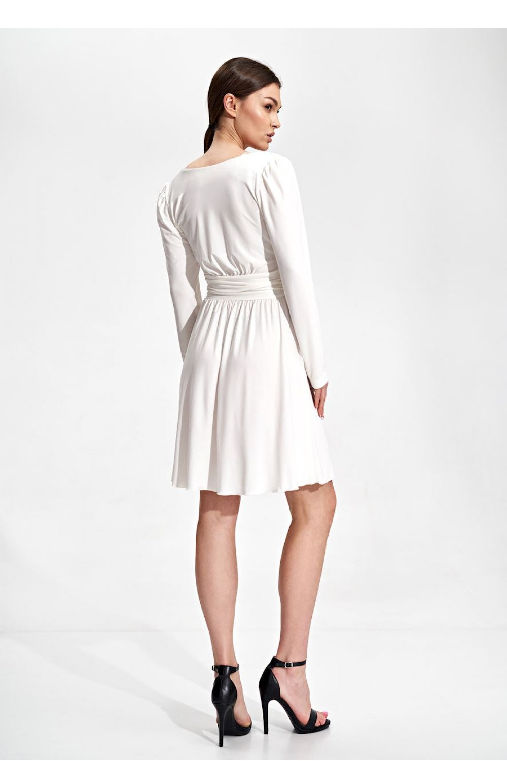 Vestido evasé hasta la rodilla en tejido elástico. Amplio escote corazón y mangas largas. Cinturón drapeado con botones decorativos. Vestido sin forro ni cierre.