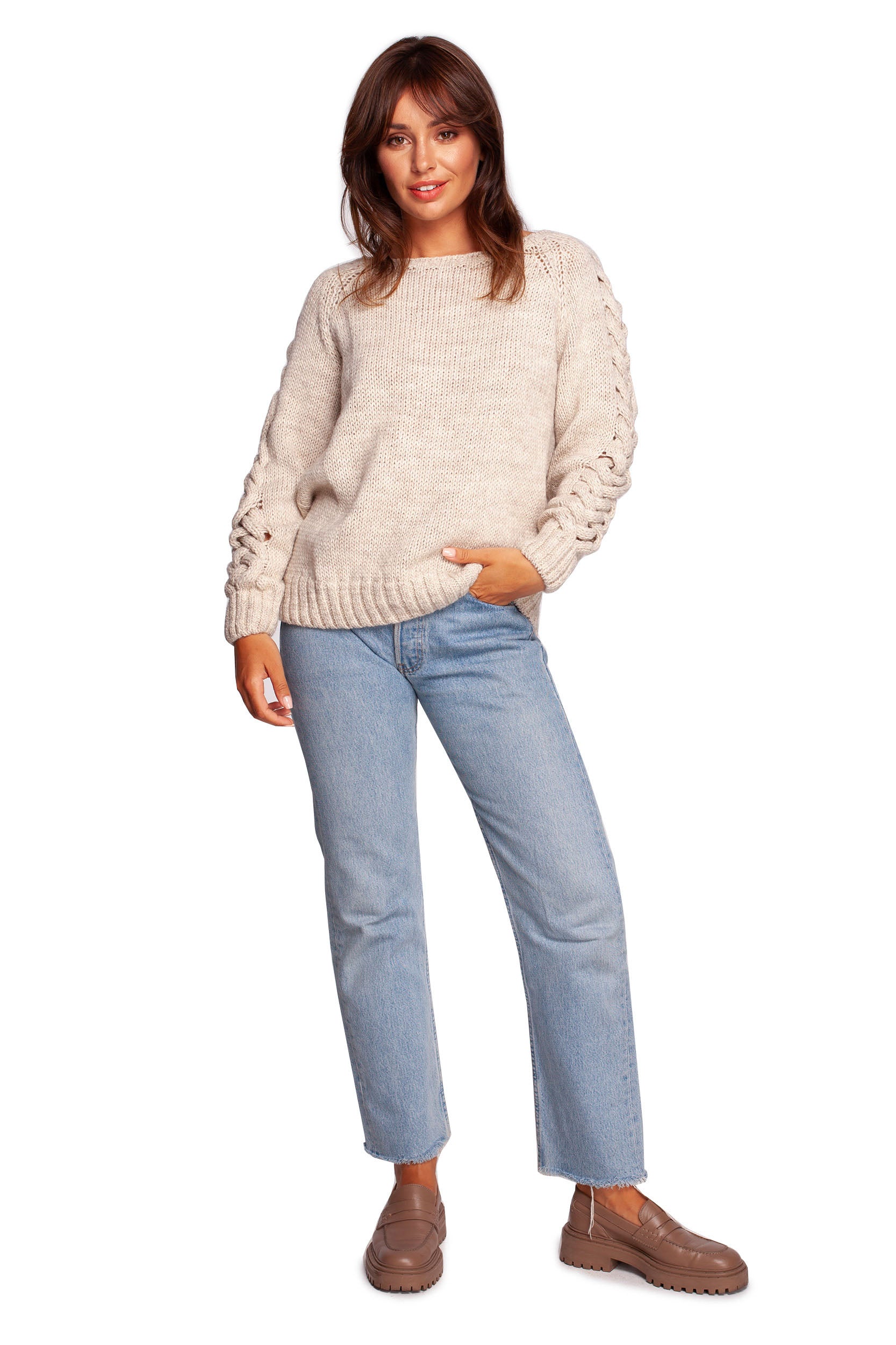 Un suéter entallado con un escote que deja ligeramente al descubierto los hombros y con mangas decoradas con un grueso tejido de cuadros, es el top perfecto para estilizar otoño-invierno.