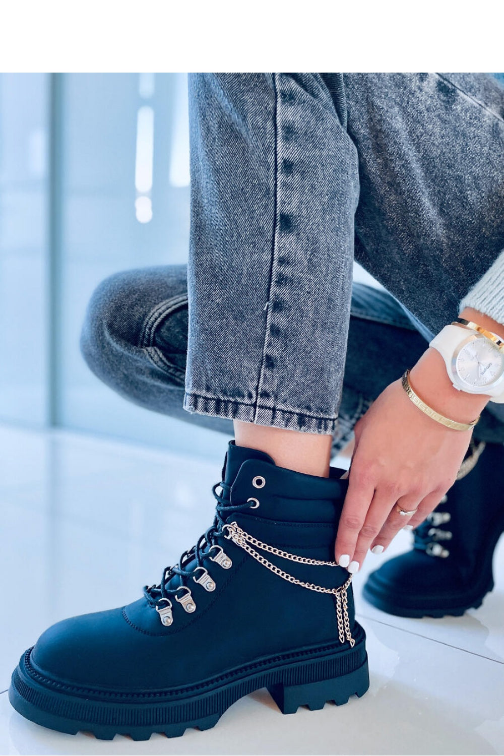 ¿Botas con cordones para mujer? Botas de cazador con suela gruesa. Si buscas unas botas cómodas que no querrás quitarte, ¡acabas de encontrarlas! : ) La parte superior está adornada con el detalle más moderno de la temporada: una cadena que enfatiza su carácter único. Están confeccionados en piel orgánica y el interior está forrado con pelo suave.