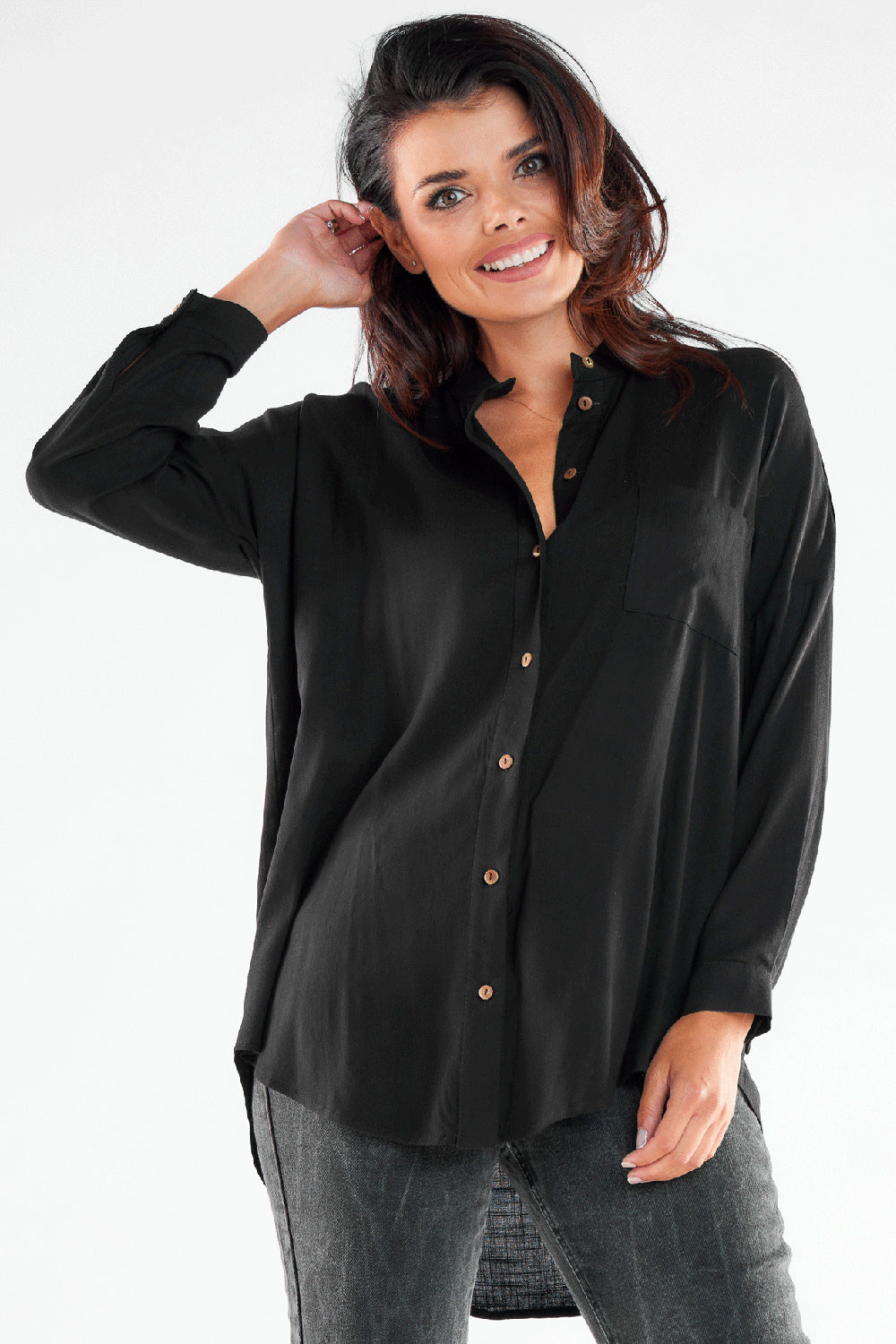 Elegante camisa de manga larga con cuello alto. Tiene la espalda alargada y está abotonada. Perfecta para reuniones de negocios y para el día a día. Producto diseñado y confeccionado en Polonia.