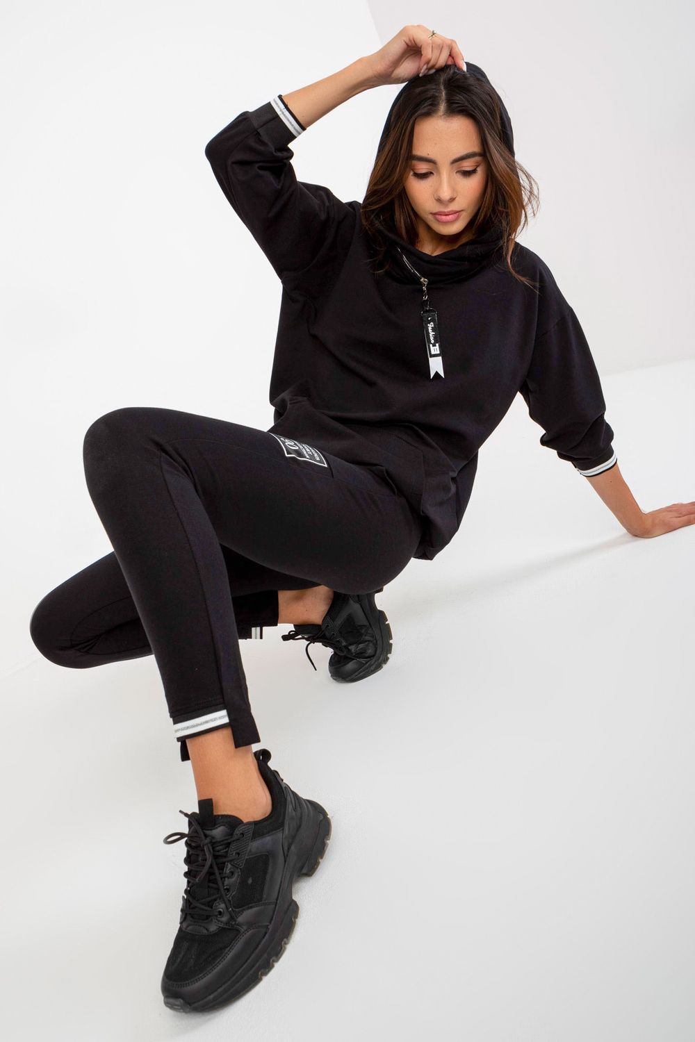 Conjunto compuesto por sudadera y pantalón. Sudadera de manga larga, capucha y bolsillo tipo canguro. Pantalón largo con lazo en la cintura y bolsillos laterales.