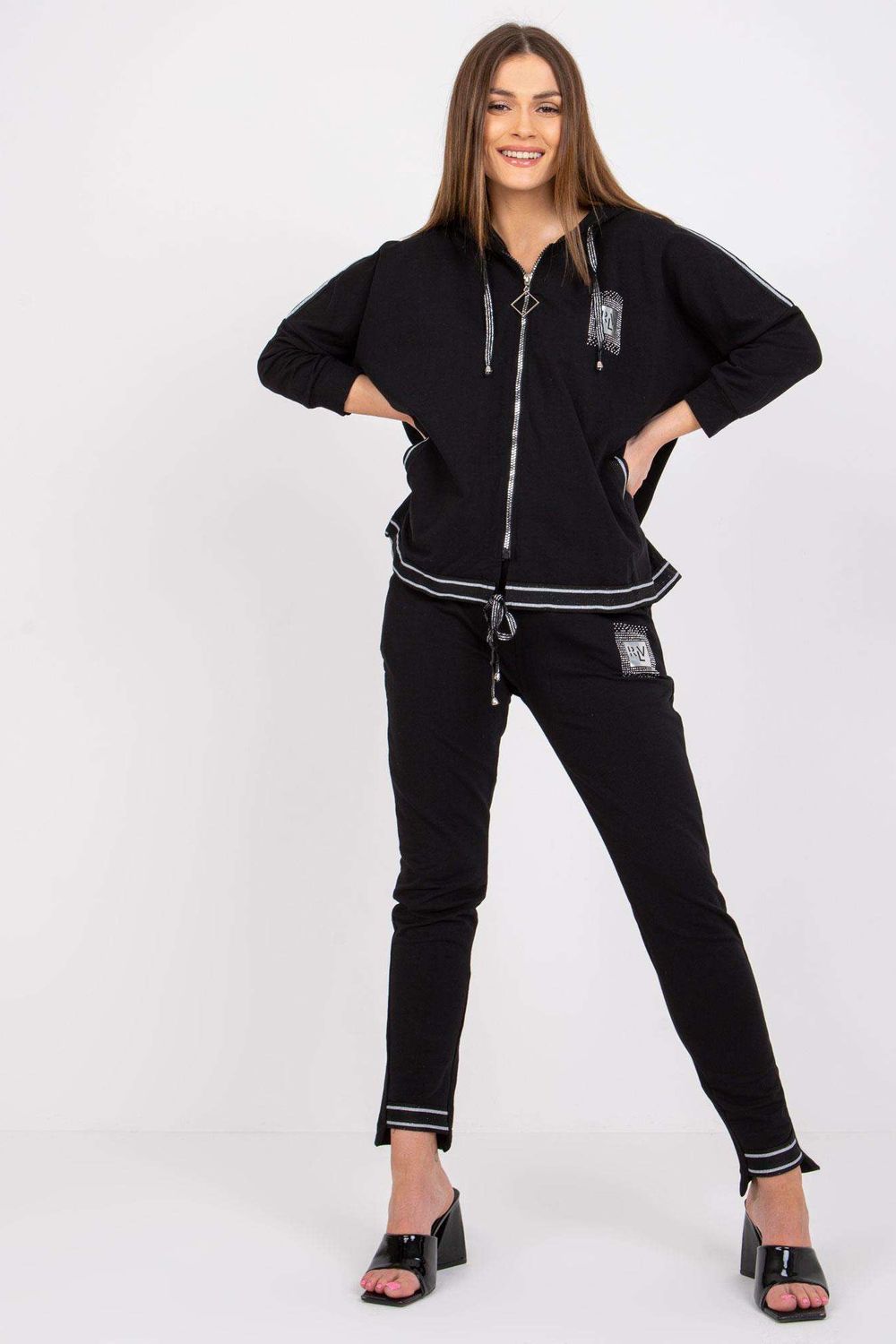 Conjunto de mujer de algodón compuesto por sudadera y pantalón. Sudadera de corte más holgado, con cremallera, manga 3/4 y capucha. Pantalón largo con cinturilla elástica y bolsillos abiertos. El conjunto está decorado con estrases.