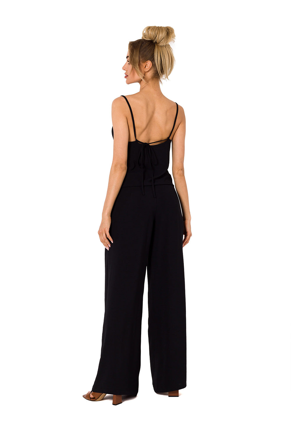 Traje pantalón con escote drapeado y tirantes finos atados en la espalda. Tiene cinturilla elástica y bolsillos laterales.