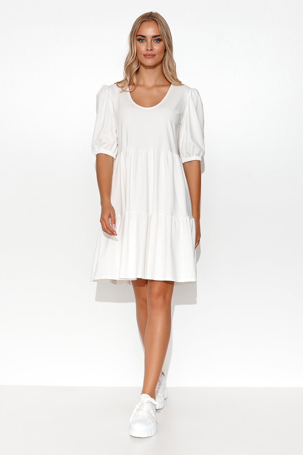 Un precioso vestido informal confeccionado en tejido de punto vaporoso. Sólo lleva un parche decorativo en la parte trasera. Puedes diseñarlo de muchas maneras elegantes. Las mangas con abullonadas te darán un encanto juvenil. A su vez, el largo hasta la rodilla dejará al descubierto tus piernas torneadas. La parte inferior del vestido está dividida en segmentos. El escote redondo deja al descubierto la clavícula y deja espacio para tus joyas favoritas. Llévalo con zapatillas cómodas o sandalias elegantes y disfruta de lo casual combinado con la moda chic.