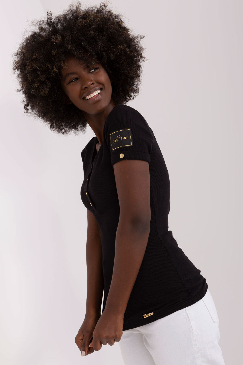 Blusa de corte entallado confeccionada en tejido canalé. Blusa de manga corta y escote redondo. Cierre con botones decorativos en la parte delantera.