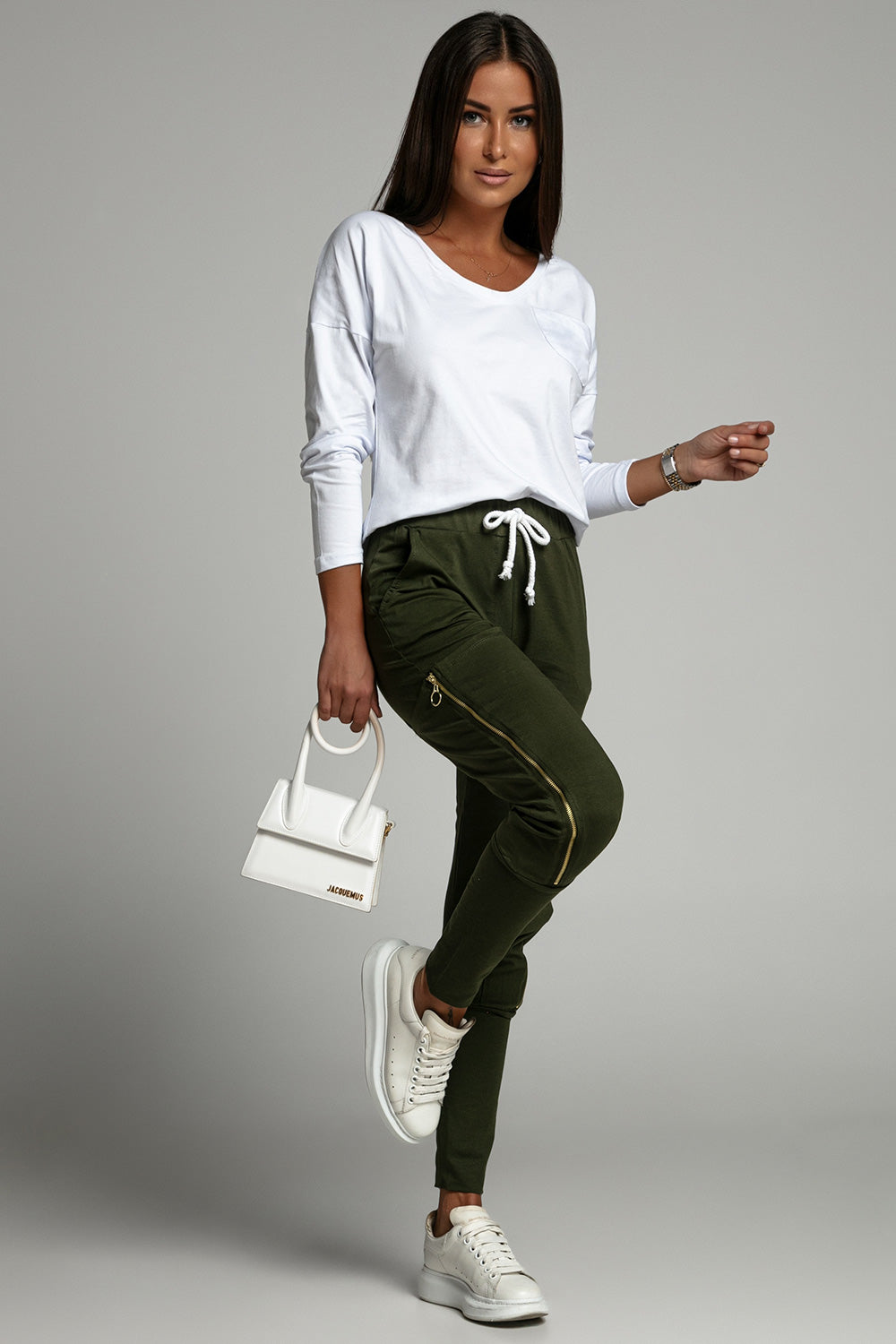 Conjunto de mujer compuesto por blusa y pantalón. Pantalón largo militar con lazo en la cintura, bolsillos abiertos y cremalleras. Blusa de manga larga y escote redondo.