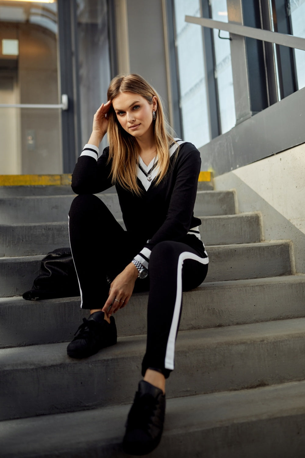 Conjunto de chándal deportivo en color negro. Sudadera con escote en "V" profundo en la parte delantera y en la espalda rematada con ribete blanco. Con mangas largas. Sudadera rematada con bajo amplio en bajo y mangas. Pantalón con cinturilla elástica y cordón para atar. Piernas largas y ligeramente cónicas, con bolsillos delante y ribetes en los laterales. El conjunto está confeccionado con un tejido de punto de algodón fino y elástico. Una parte indispensable del armario de una mujer. Quieres sentirte a la moda y cómoda, este chándal es perfecto para ti.