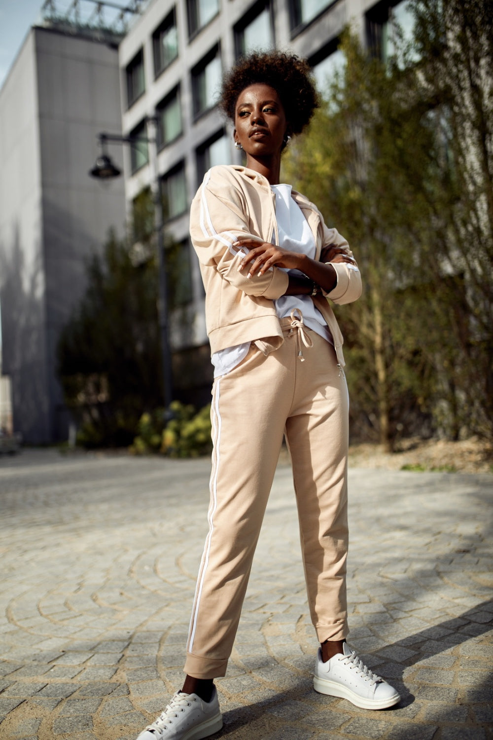 El conjunto de chándal beige con rayas es imprescindible en todo armario. Versátil y atemporal, el conjunto funcionará para un estilo deportivo y cotidiano. Sudadera con cremallera, manga larga y capucha. Pantalón largo con cinturilla elástica y ribete. Conjunto con rayas en contraste.