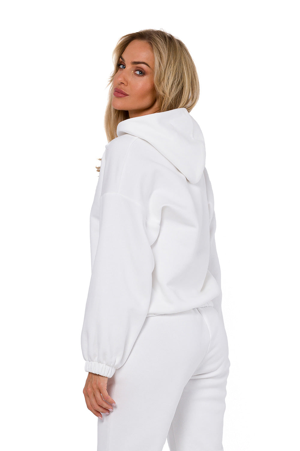 Sudadera de mujer con mangas largas y capucha. Está confeccionada en tejido de punto con drapeado interior. Costuras decorativas en la parte delantera. Mangas y bajo con elástico cosido. Diseñada y confeccionada en Polonia.