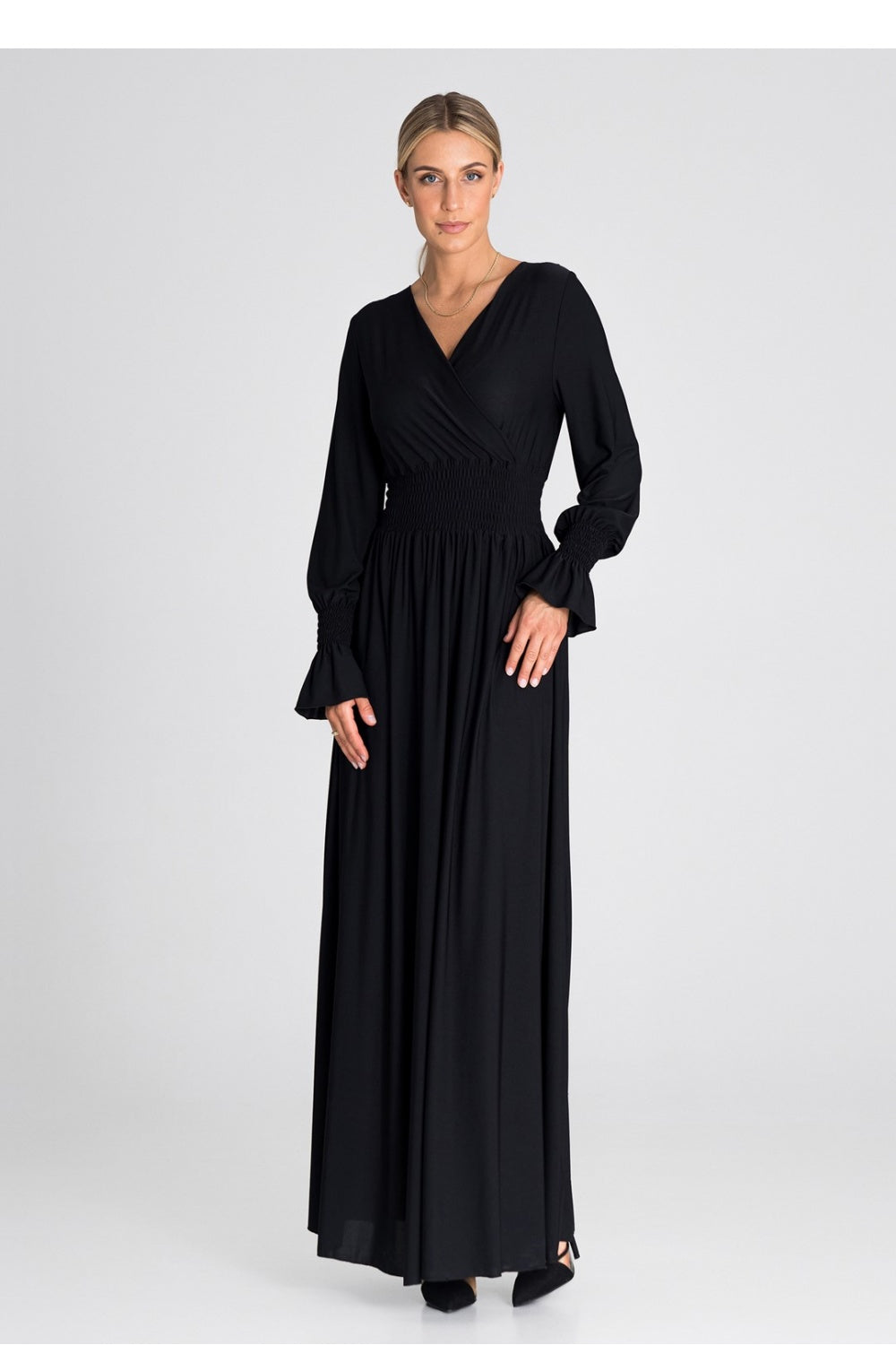 Aquí tienes un hermoso vestido largo que destaca por su estilo único. Las mangas del buffet están decoradas con pliegues con bandas elásticas, añadiendo elegancia y encanto. El escote está superpuesto, lo que le da sutileza al vestido. Arrugado en la cintura, realza la cintura y aporta ligereza. En la pierna izquierda hay una llamativa rotura, que le da al vestido un toque de sex-appeal y le permite moverse libremente. Este es un vestido que seguramente llamará la atención en varios eventos, aumentando tu confianza y estilo.