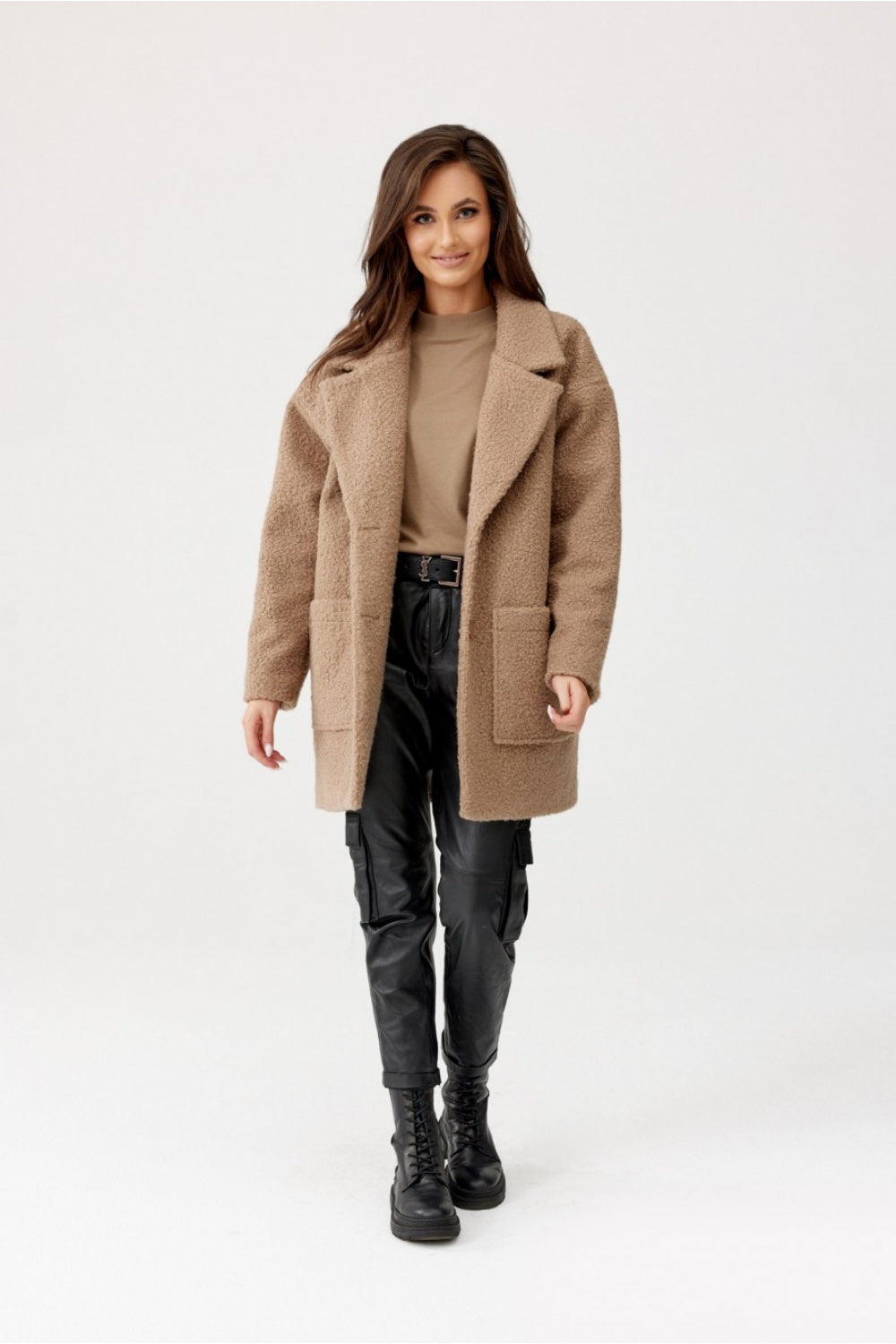 Chaqueta larga Sanchez con botones anchos. Fabricada con material de alta calidad y tacto agradable. Esta chaqueta larga con cuello para mujer es un éxito rotundo de otoño y primavera. Destaca especialmente su versatilidad, gracias a su tejido suave y agradable al tacto con textura de piel de oveja. El modelo cuenta con forro interior. Sanchez destaca por su acabado de alta calidad y su corte único, que la distingue de las prendas clásicas disponibles en el mercado. Esta chaqueta de botonadura sencilla combina a la perfección con pantalones de traje, tanto en un estilo elegante como informal con vaqueros. Fabricada y confeccionada en Polonia.