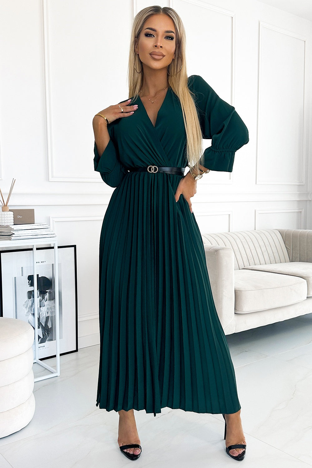 Vestido plisado Serena con escote, cinturón negro y mangas 3/4, confeccionado en tela verde lisa. Un vestido perfecto para cualquier ocasión. Marca numoco basic. Fabricación europea.