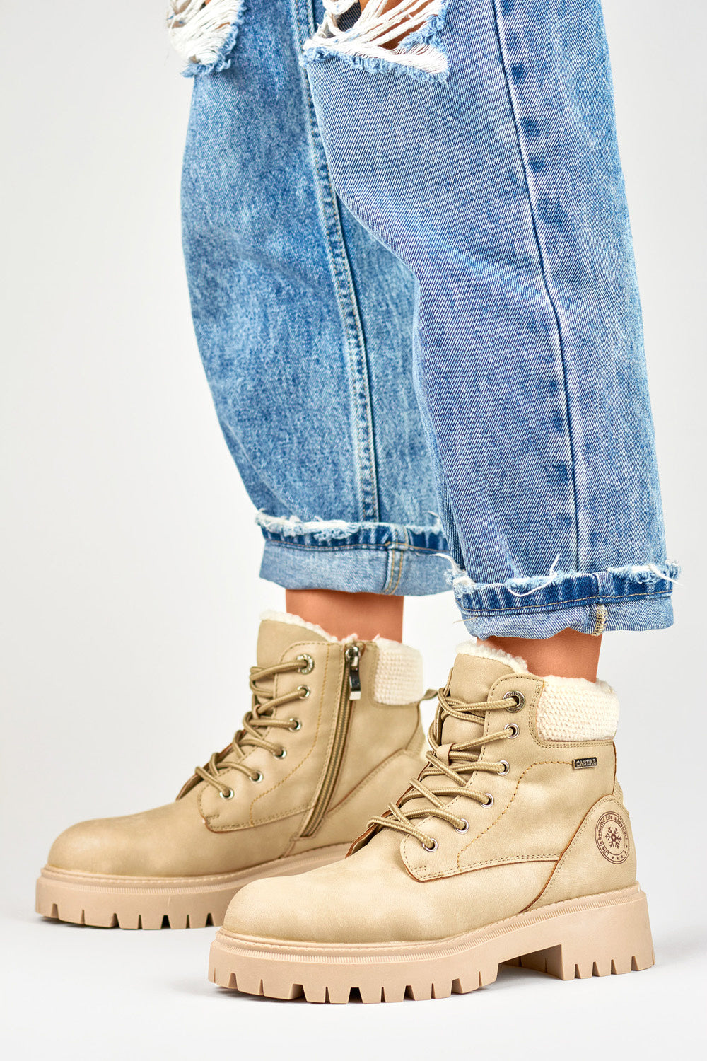 Estos elegantes tramperos en un delicado tono beige son el calzado perfecto para la temporada otoño/invierno para las mujeres modernas que valoran la comodidad y el diseño moderno. La parte superior del calzado está hecha de cuero ecológico duradero, lo que le da a los zapatos un aspecto elegante. Su altura de 12 cm proporciona no sólo un diseño moderno, sino también una protección extra contra el frío, lo que los convierte en una opción ideal para los días de invierno. El interior de los tramperos está forrado con una agradable piel ecológica, lo que los hace extremadamente cómodos y cálidos. El aislamiento es la solución perfecta para los días más fríos, asegurando una temperatura óptima para tus pies. Las botas cuentan con cordones prácticos, que permiten una fácil personalización y garantizan un ajuste seguro. Además, la cremallera facilita ponerse y quitarse los zapatos. La punta redonda hace que los tramperos sean cómodos y versátiles, y combinan con una variedad de estilos. Un pequeño tacón de 4,5 cm de altura aporta elegancia a los zapatos, a la vez que los mantiene estables. Disfrute de una comodidad excepcional y un estilo moderno eligiendo estas botas de cazador para los días de invierno.