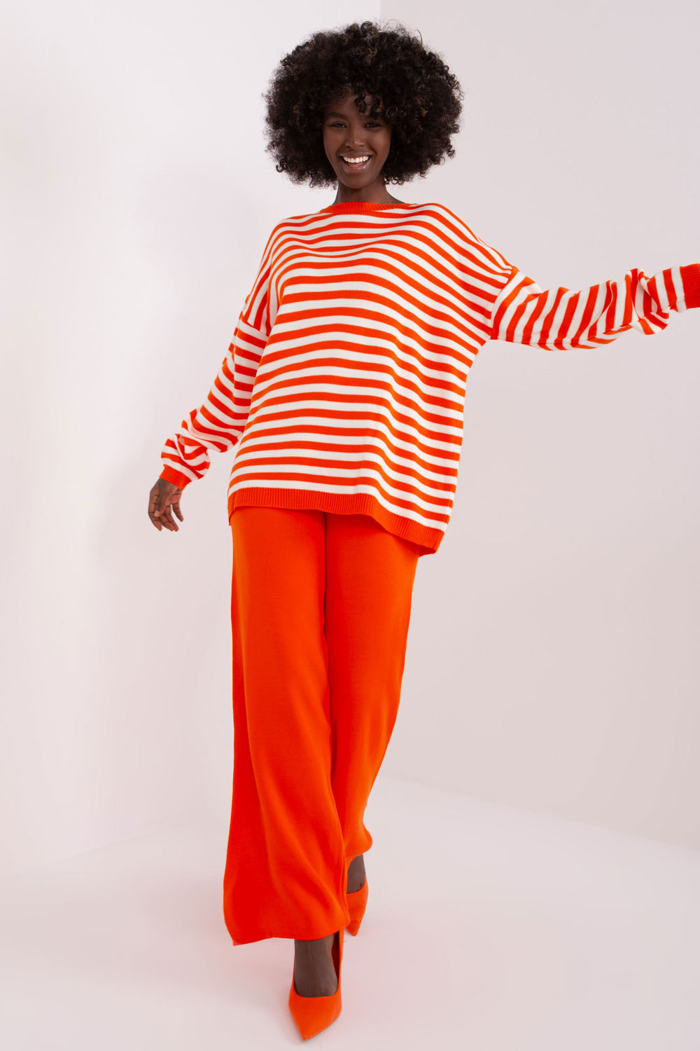 Este conjunto de suéter y pantalón a rayas en un color es una excelente opción para quienes aprecian la comodidad y el estilo casual a la moda. Confeccionado en acrílico de alta calidad, el suéter garantiza una agradable sensación de calidez y suavidad, perfecto para el uso diario. El jersey de rayas aporta energía y diversión al conjunto, haciéndolo único. El escote redondo y la manga larga aportan un toque clásico, permitiéndote llevar este conjunto no sólo para las salidas del día a día, sino también para reuniones con amigos o familiares. Las perneras anchas garantizan comodidad y libertad de movimiento, mientras que la cintura alta añade una nota de diseño contemporáneo. Todo el look es muy elegante e impresionante, y agrega carácter a cualquier estilo. Esta es una opción ideal para una variedad de ocasiones, desde reuniones con amigos hasta veladas relajantes en casa.