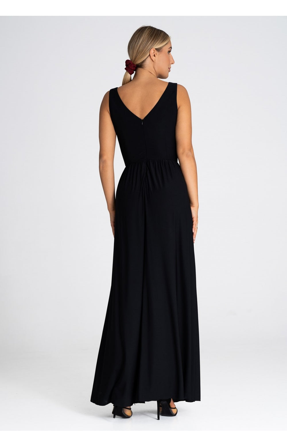 Vestido largo con escote en V delante y detrás. Corte a la cintura para realzar la figura. Abertura frontal llamativa.