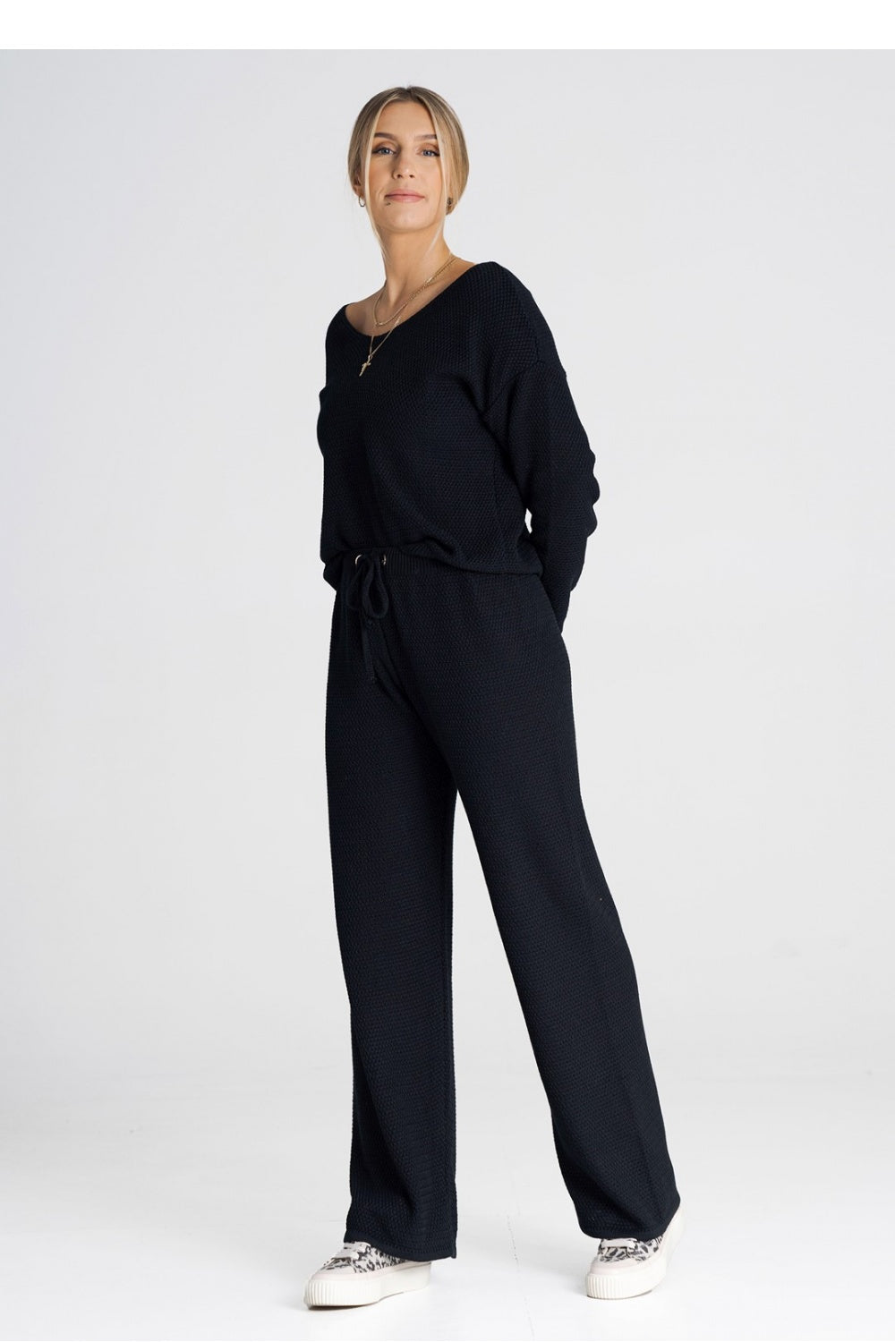 Conjunto compuesto por sudadera de manga larga y pantalón largo holgado atado a la cintura.