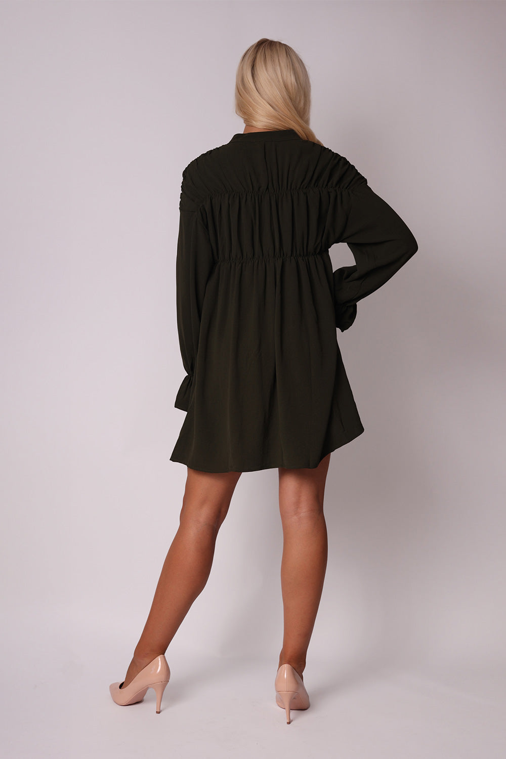 ¡Sal con estilo con nuestro vestido verde oliva de manga larga! La combinación perfecta entre estilo y comodidad, este vestido será tu nueva elección. Es de manga larga con puños, pliegues elásticos y cierre con botones. El vestido lucirá fenomenal dependiendo de los complementos con los que complementes el estilismo.