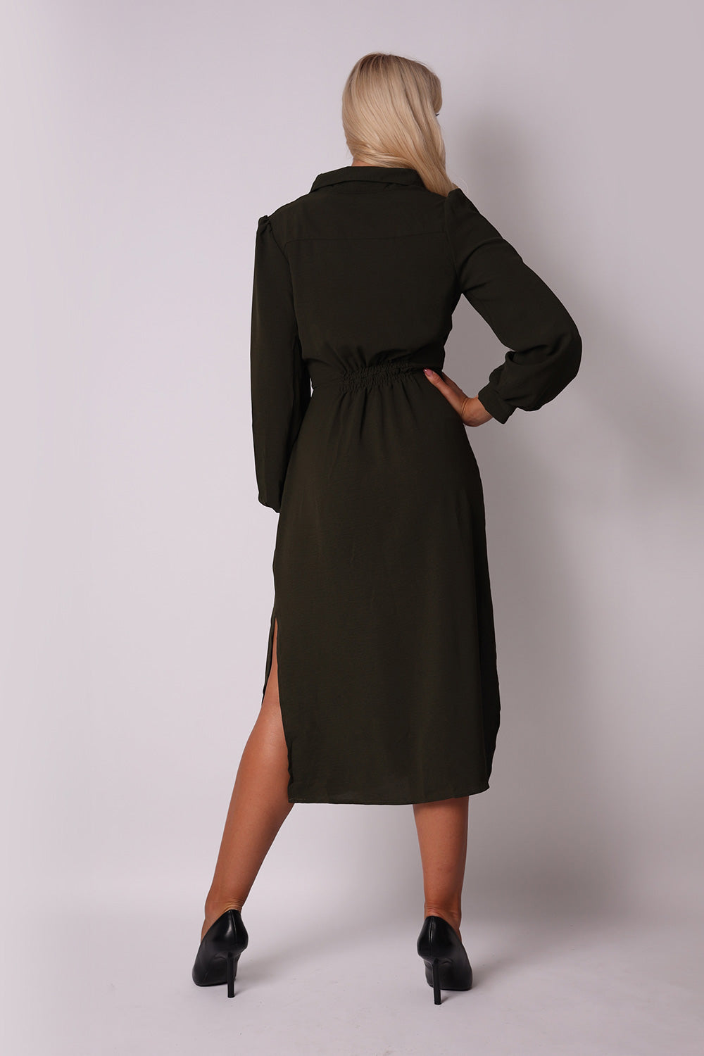 Este vestido midi de color oliva con lazo frontal y cierre de botón es una pieza de armario fácil de combinar. Tiene cuello clásico, manga larga acabada en puño y cintura elástica. Combínalo con conversos o botas para un look casual, o usa tus stilettos favoritos y un bolso a juego para ocasiones nocturnas.