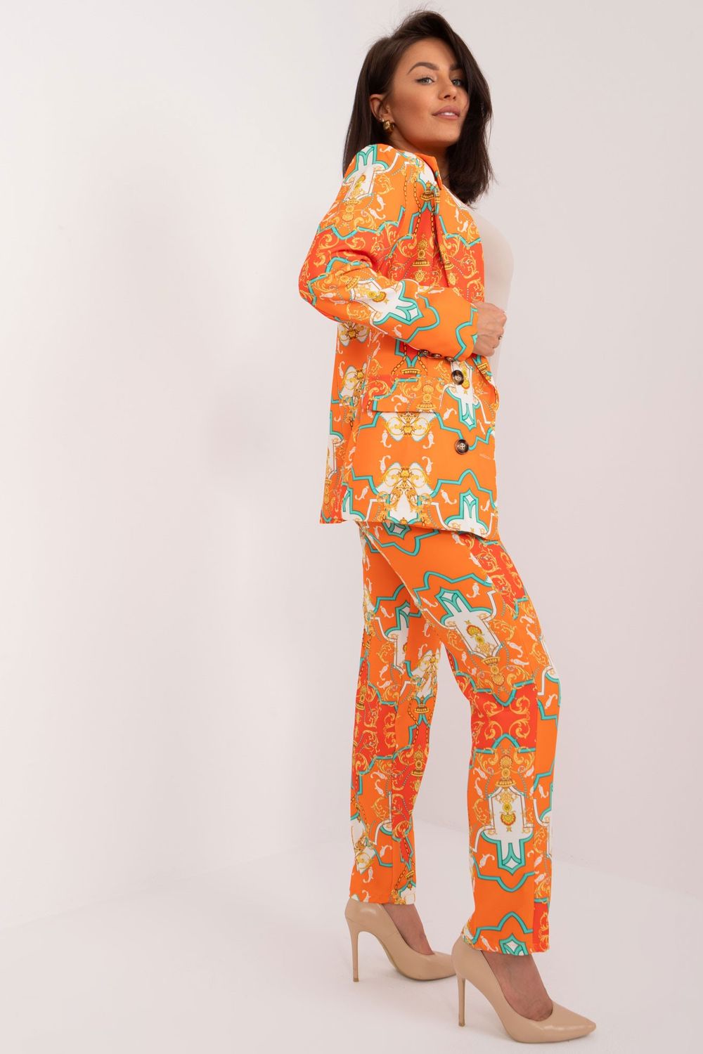 Este elegante conjunto para mujer es ideal para diversas ocasiones, desde el día a día en el trabajo hasta una fiesta o reunión de negocios. Consta de una chaqueta de manga larga y un pantalón largo con cierre de cremallera y botón. La chaqueta está confeccionada con materiales de alta calidad, lo que garantiza elegancia y comodidad. Se abotona y las solapas le aportan un toque clásico. La chaqueta está forrada para mayor comodidad y un mejor ajuste. Los pantalones tienen perneras rectas y cintura alta, lo que los hace no solo elegantes, sino también cómodos y ajustados. El cierre de cremallera y botón garantiza facilidad de colocación y durabilidad. Este conjunto está decorado con un estampado que le aporta originalidad y carácter. Gracias a su largo estándar y perneras rectas, se puede combinar fácilmente con diversas prendas, creando una variedad de estilos. Además, los bolsillos laterales del pantalón son prácticos y prácticos. Con su confección de alta calidad y su elegante diseño, este conjunto para mujer será una excelente opción para diversas ocasiones.