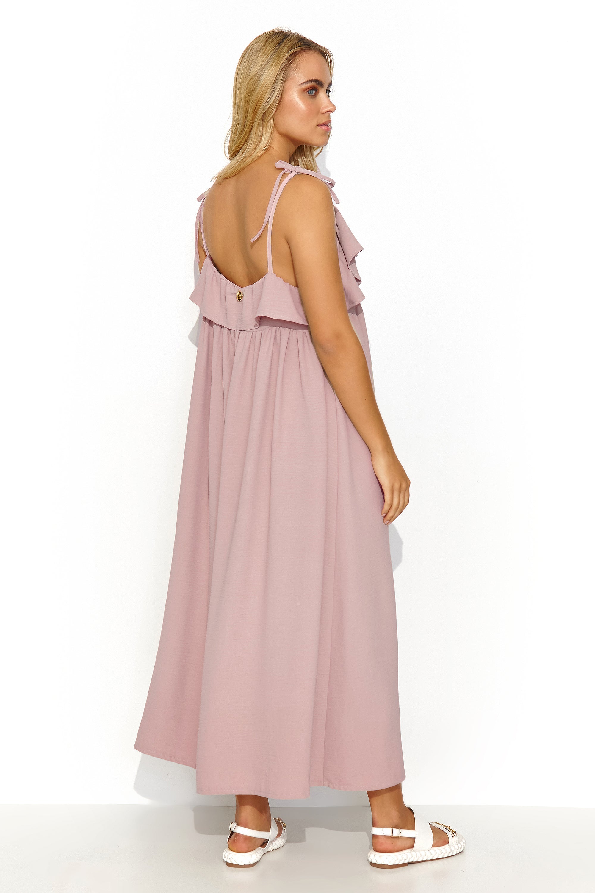 Vestido largo oversize con tirantes finos, confeccionado en tejido fluido y vaporoso. Nuestra creación es perfecta para la cálida primavera y el verano. En la espalda, un elegante detalle brillante le da al conjunto un sutil brillo. El volante, que envuelve suavemente el escote y la espalda, le aporta un toque sensual. La parte inferior del vestido es sumamente informal, por lo que no restringe el movimiento; puedes bailar, caminar o jugar con niños con total libertad. La creación está disponible en modernos colores. Nuestro estilo sin duda te dará un look chic tanto en casa como en una cita con tu pareja o un paseo con familiares y amigos. El largo del vestido se mide desde la axila.