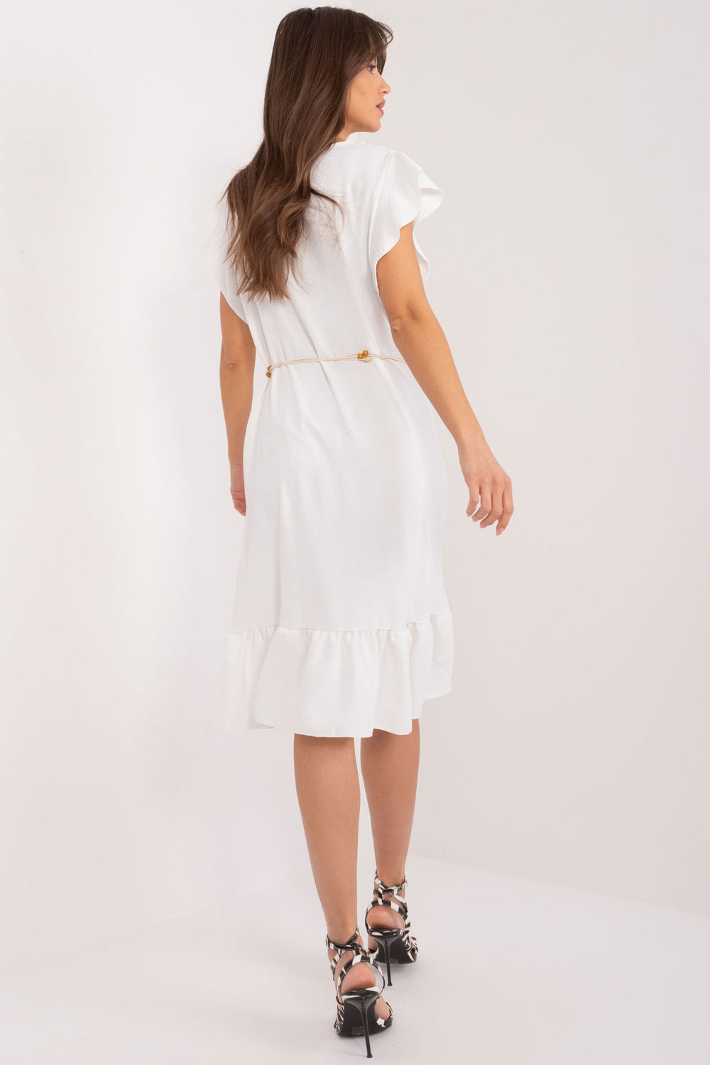 Un vestido de verano para diario que realzará tu feminidad y te brindará comodidad a diario. Confeccionado en poliéster suave, este modelo es ideal para días cálidos, ya que ofrece libertad de movimiento y ligereza. Su corte acampanado le da una sensación ligera y vaporosa, convirtiendo cada movimiento en una danza extremadamente sutil. El corte asimétrico, con la espalda ligeramente más larga, le aporta un carácter y una elegancia únicos. El vestido tiene mangas cortas con volante, que le aportan delicadeza y encanto juvenil. El escote redondo es versátil y combina a la perfección con diversos accesorios. Incorpora un cinturón que realza la cintura y le da un encanto único. Además, un volante en la parte inferior le aporta sutileza y ligereza. El largo del vestido llega hasta la rodilla, lo que lo convierte en una opción perfecta para diversas ocasiones, desde reuniones con amigas hasta el día a día. Su sencillez y elegancia lo convierten en un vestido que sin duda se convertirá en uno de tus favoritos para los días de verano.