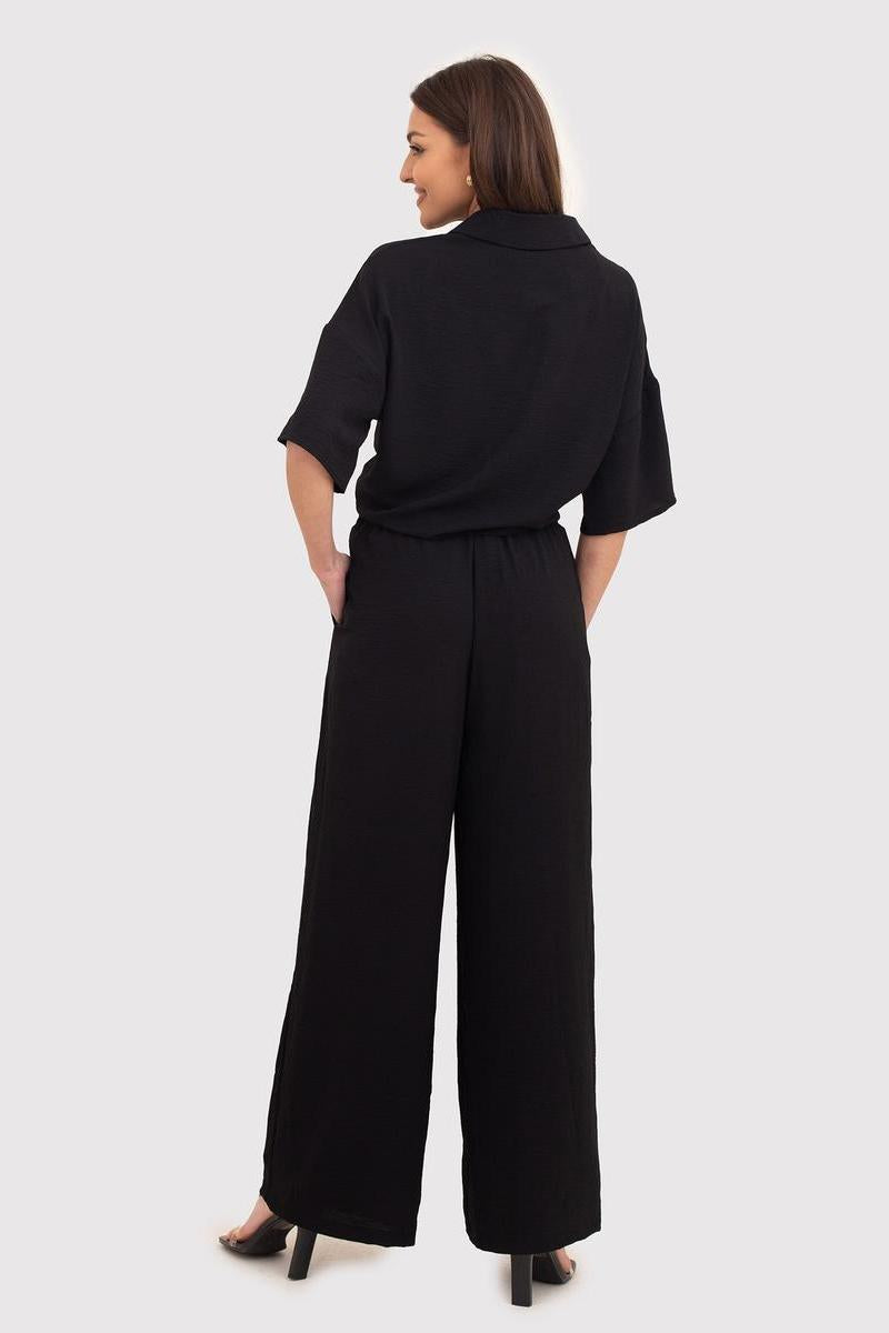 Pantalón negro de pernera ancha y cinturilla elástica. Están confeccionados en tejido ligero de lino y tienen perneras anchas y rectas con cinturilla elástica. Combinan perfectamente con la camiseta TA572 de nuestra oferta. Crea un conjunto atemporal que se puede utilizar en muchas ocasiones.