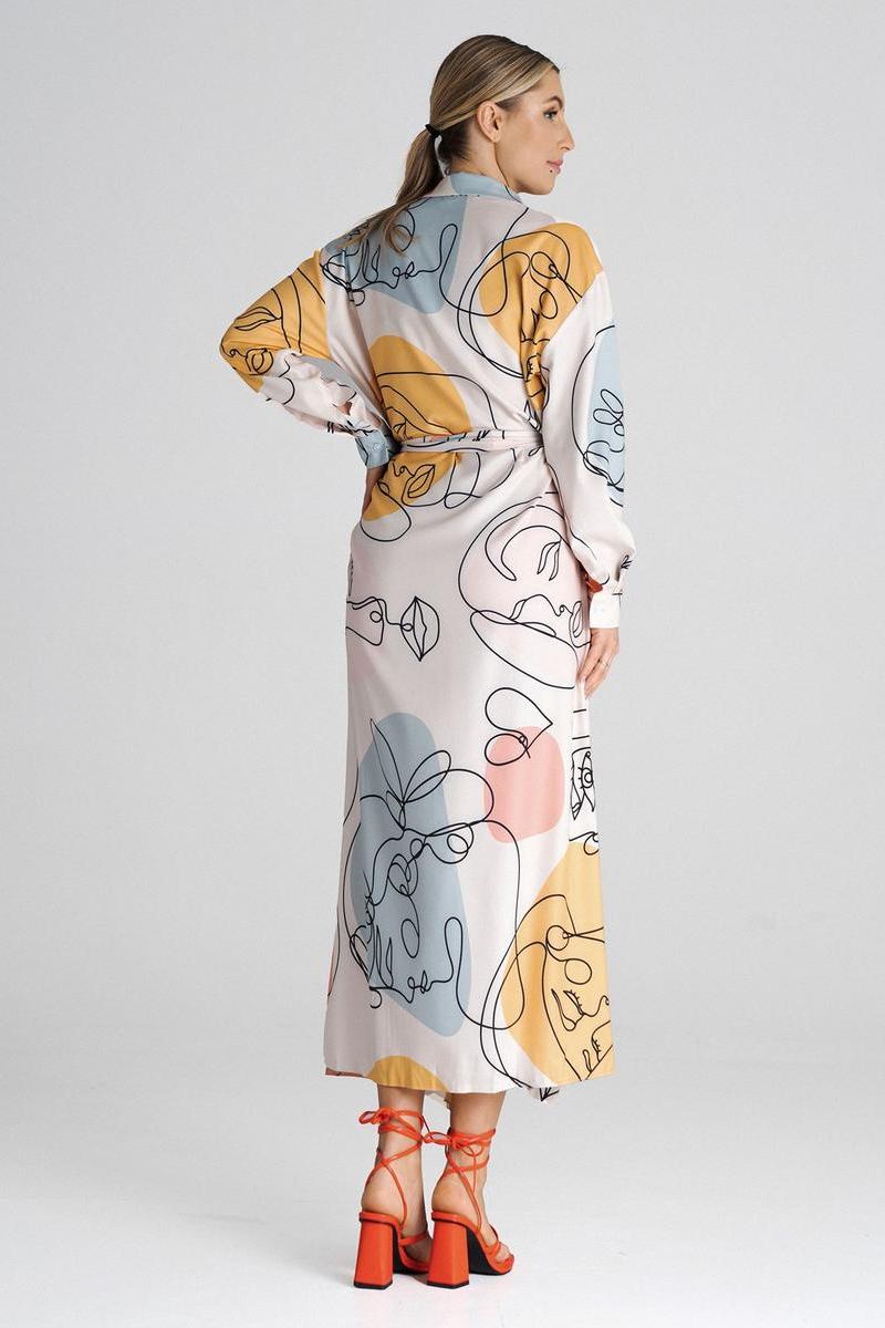 Vestido camisero largo con cuello. Solapas decorativas en el busto. Mangas largas con puños abotonados. Vestido abotonado, atado a la cintura. Aberturas laterales. Vestido sin bolsillos ni forro.