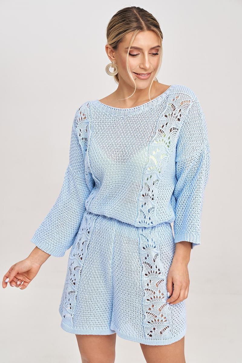 Conjunto de dos piezas compuesto por blusa y short. La blusa está decorada con inserciones de punto en la parte delantera. Tiene mangas 3/4 y escote redondo. Los shorts tienen inserciones de encaje.