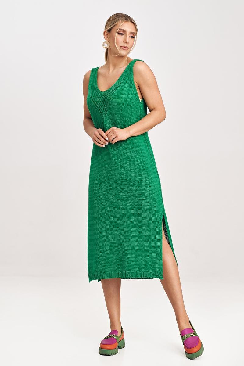 Conjunto de dos piezas compuesto por un vestido midi y un bolero. Bolero de manga larga, abierto al frente con un lazo decorativo. El vestido tiene tirantes anchos y escote pronunciado.