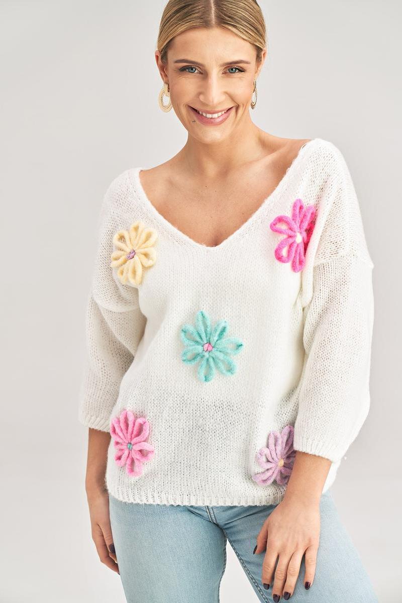 Jersey con manga 3/4 y escote en pico. En la parte delantera del suéter hay adornos en forma de flores.