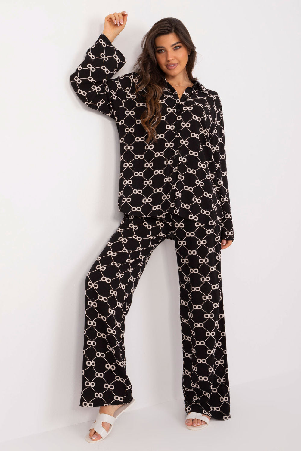 Descubre un conjunto de verano para mujer compuesto por una elegante camisa y un cómodo pantalón. Este conjunto es perfecto para el día a día, combinando comodidad y estilo. La elegante camisa se abotona, lo que facilita su colocación y extracción. Además, incorpora un lazo adicional en la cintura que realza la silueta y le aporta encanto. La camisa tiene mangas largas, ideal para los días más frescos. El cuello clásico le da un toque formal, equilibrando a la perfección su estilo casual. El pantalón cuenta con un lazo en la cintura que se ajusta perfectamente a la silueta. Las perneras rectas lo hacen versátil y adecuado para diversos conjuntos. La cintura alta garantiza comodidad y realza la figura. Los prácticos bolsillos laterales sin cierre añaden funcionalidad y comodidad. El conjunto luce un original estampado que llama la atención y aporta frescura a cualquier look.