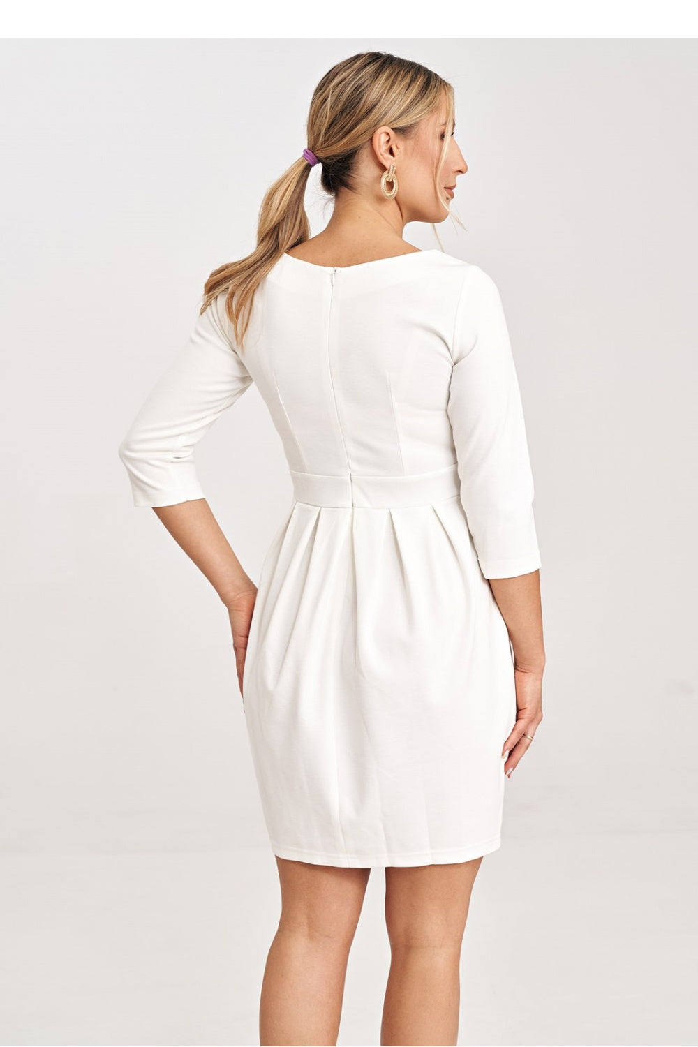 Vestido con mangas 3/4, escote semicircular y corte a la cintura. El modelo presenta un llamativo pliegue. El vestido se cierra con una cremallera oculta.