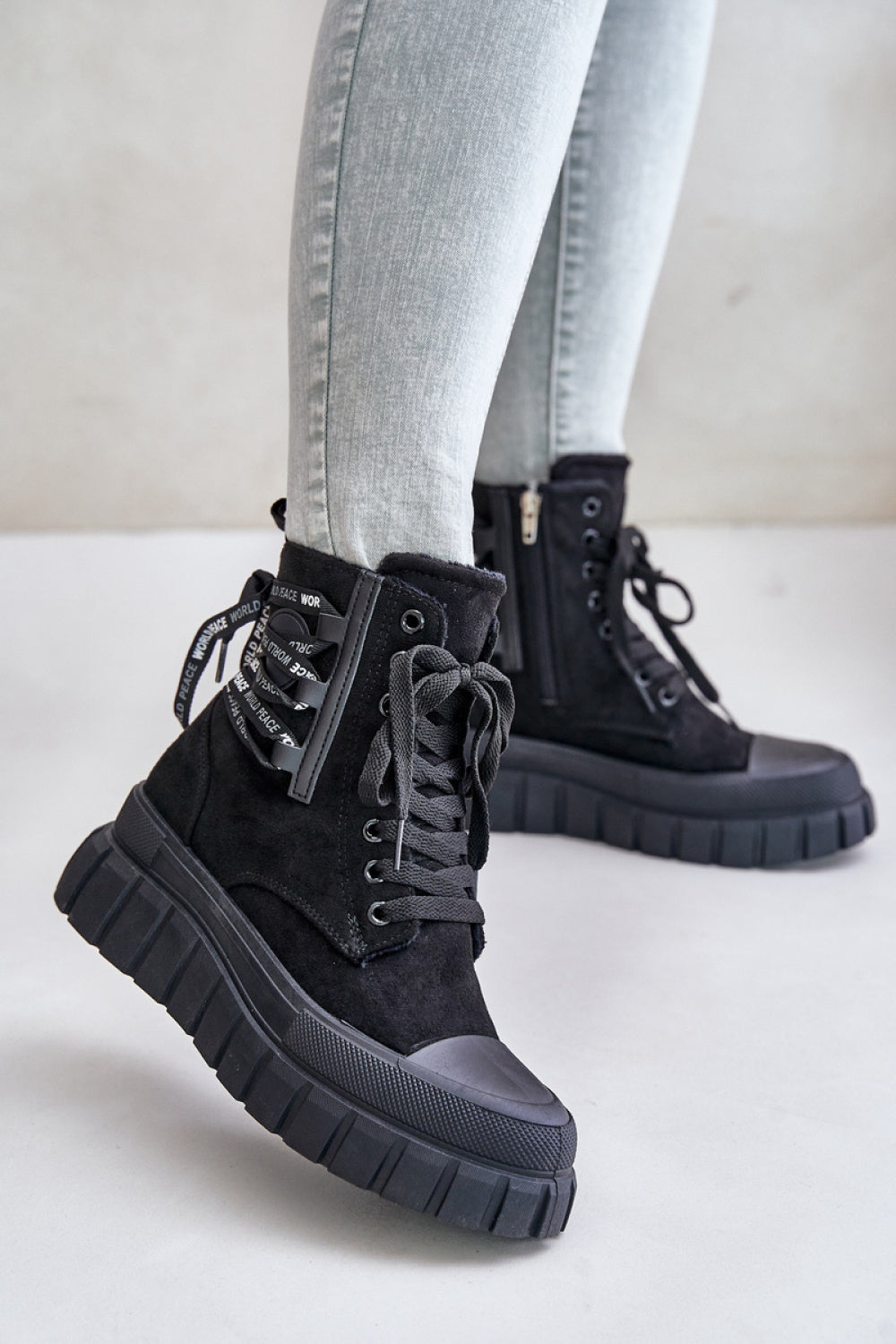 Botas de mujer confeccionadas en ante ecológico. Con cremallera y cordones. Ubicado sobre una plataforma, que aísla perfectamente del frío del suelo. Dedos redondeados. Interior aislado en forma de manta para zapatos. Este modelo se distingue por un cordón decorativo adicional en la parte trasera. ¡Definitivamente deberías tenerlos!