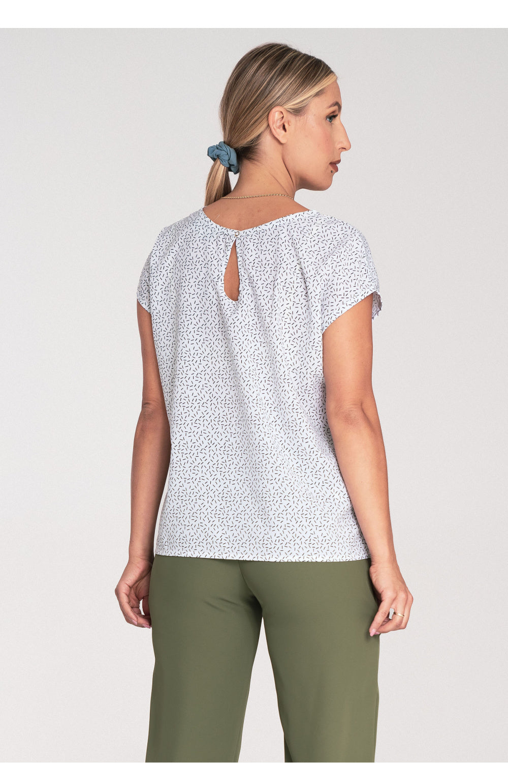 Blusa de corte sencillo con mangas cortas. Tiene cuello redondo y cierre de broche en la espalda.
