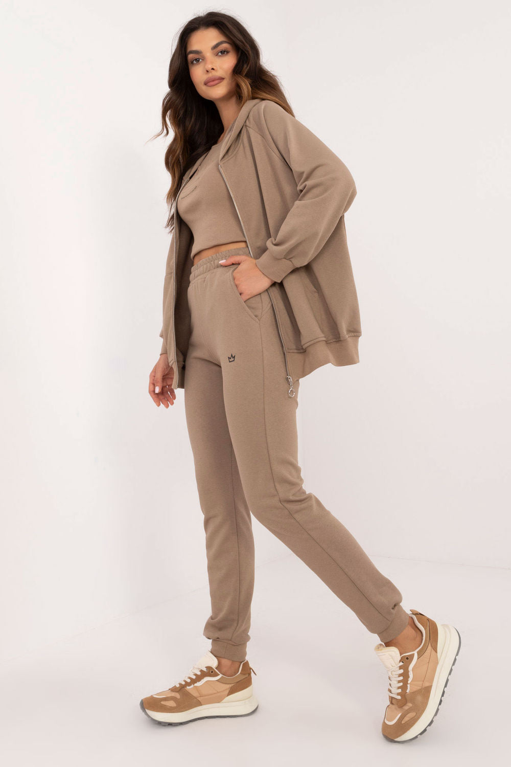 Conjunto de sudadera de mujer de estilo casual, ideal tanto para salidas casuales como para actividades deportivas, compuesto por camiseta, sudadera y pantalón. El conjunto tiene un patrón liso, lo que le da un carácter versátil, y el material dominante es una mezcla suave y duradera de algodón y poliéster para mayor comodidad y transpirabilidad. Los pantalones tienen perneras largas acabadas con puños de canalé y tiro alto, que acentúa la silueta y da total libertad de movimiento. Hay una cintura elástica para un ajuste perfecto. Además, los pantalones tienen bolsillos laterales, prácticos y funcionales. Esta sudadera de manga larga con cremallera cuenta con bolsillos y una capucha para mayor estilo deportivo y protección contra el frío. La camiseta con clásico escote redondo es el complemento perfecto del conjunto. Este conjunto es una combinación de comodidad, funcionalidad y estilo, perfecto para el día a día y para actividades deportivas.