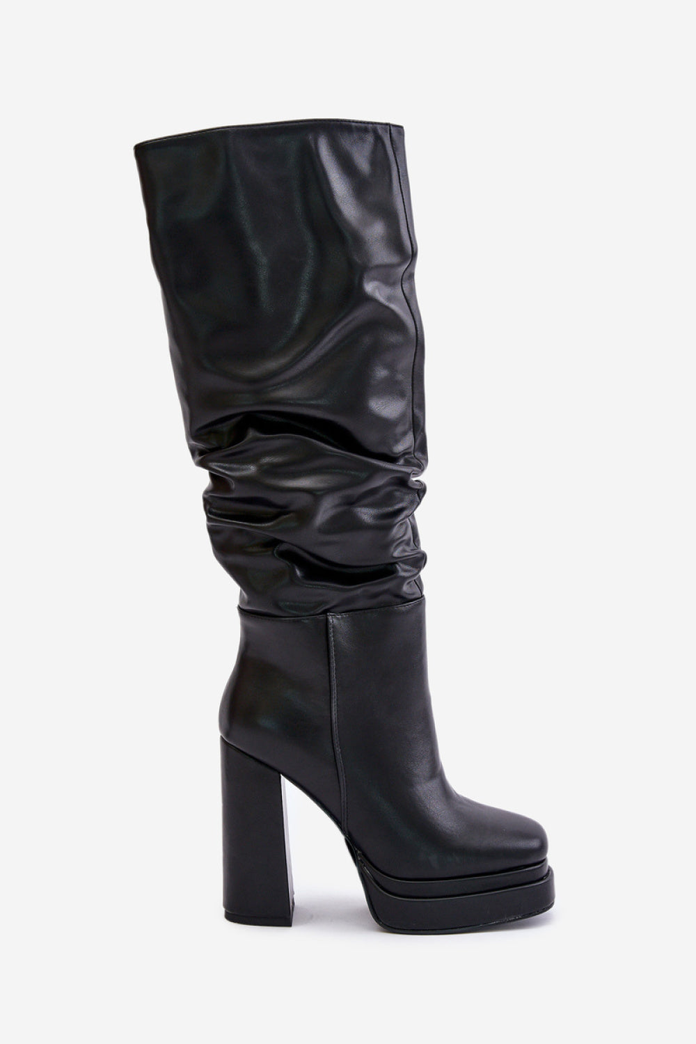 Botas de mujer de piel ecológica. Con plataforma y tacón alto, garantizan estabilidad y un look elegante. El modelo es sin cordones y tiene la punta redondeada. Su pliegue en la parte superior es característico.