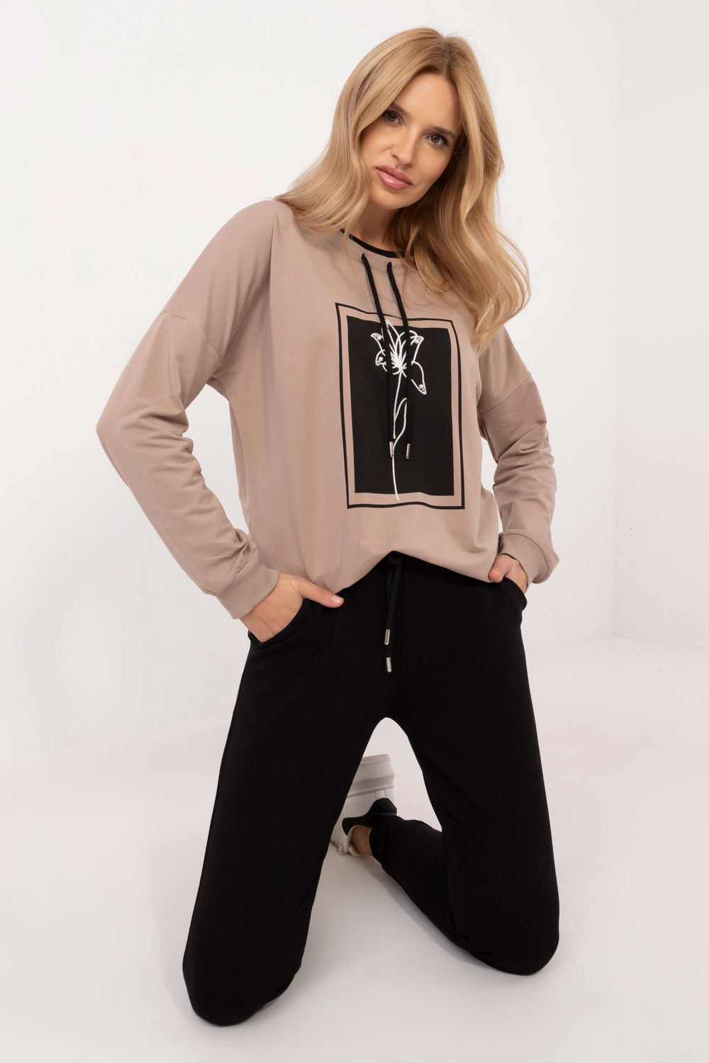 Conjunto casual de mujer compuesto por sudadera con capucha y pantalón, perfecto para el día a día. Confeccionada en una suave mezcla de algodón y elastano, proporciona comodidad y libertad de movimientos. La sudadera con capucha tiene mangas largas, cuello redondo y un estampado moderno en la parte delantera que le aporta carácter. Los pantalones de pernera larga están rematados con puños, lo que les da un aspecto deportivo, y la cintura alta realza la cintura. Además, los pantalones tienen bolsillos laterales, lo que aumenta su funcionalidad. Este conjunto liso es una elección perfecta para quienes aprecian la comodidad y el estilo en sus outfits diarios.