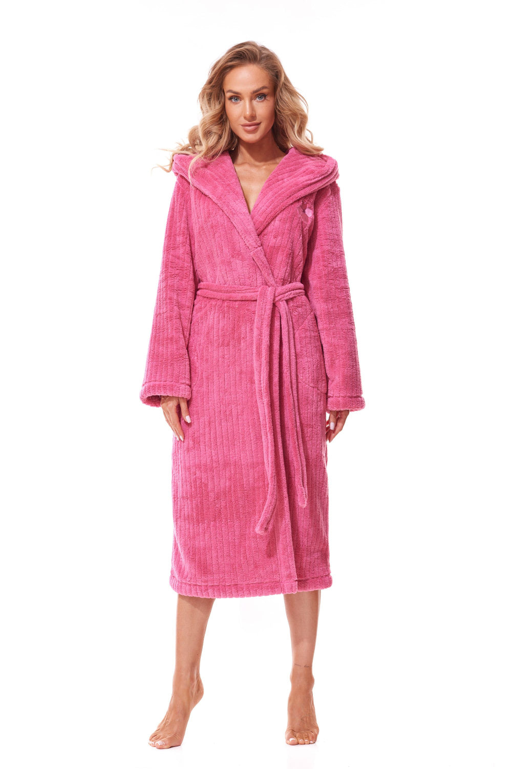 Albornoz de mujer de corte holgado y cómodo, confeccionado en suave tejido de punto con textura acanalada para mayor comodidad y calidez. El largo por encima de la rodilla lo hace perfecto como prenda para estar en casa y como accesorio elegante para las noches tranquilas. El albornoz tiene prácticos bolsillos en los laterales y un bordado decorativo que le da un toque único. Atado con un cinturón, permite un ajuste relajado. Presentado en una elegante bolsa, también es una idea de regalo ideal para un ser querido, ya que combina comodidad con elegancia.