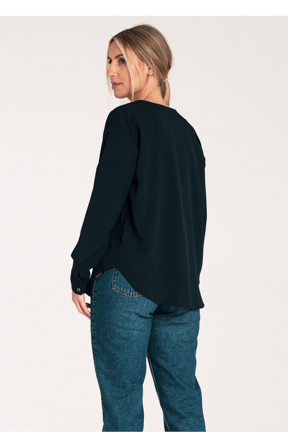 Camisa de manga larga con puños abrochados con botones a presión. Escote atrevido, sin cuello. La camisa se abrocha por delante con botones a presión.