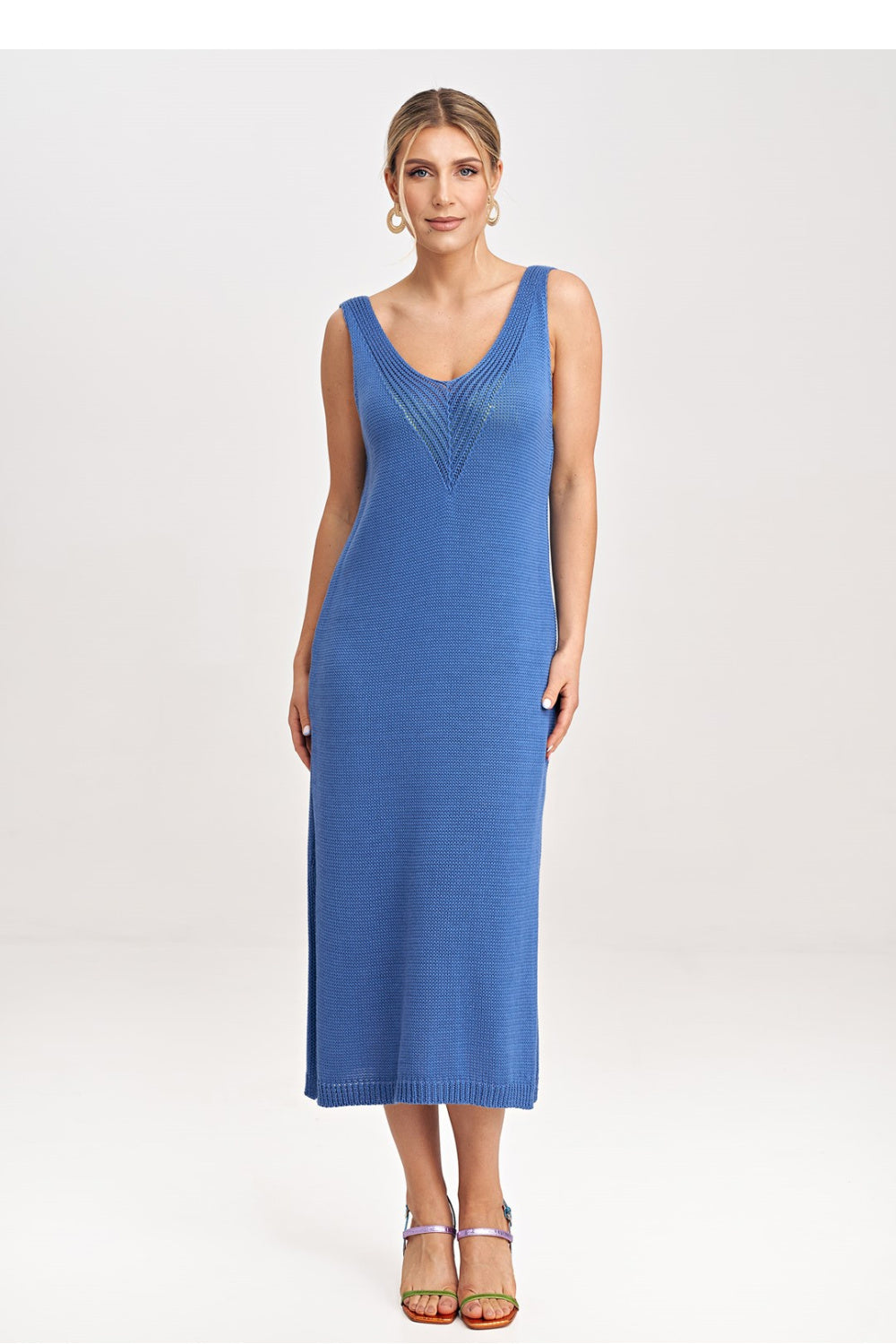 Conjunto de dos piezas compuesto por un vestido midi y un bolero. Bolero de manga larga, desabrochado con un lazo decorativo en la parte delantera. Vestido de tirantes anchos y escote pronunciado.