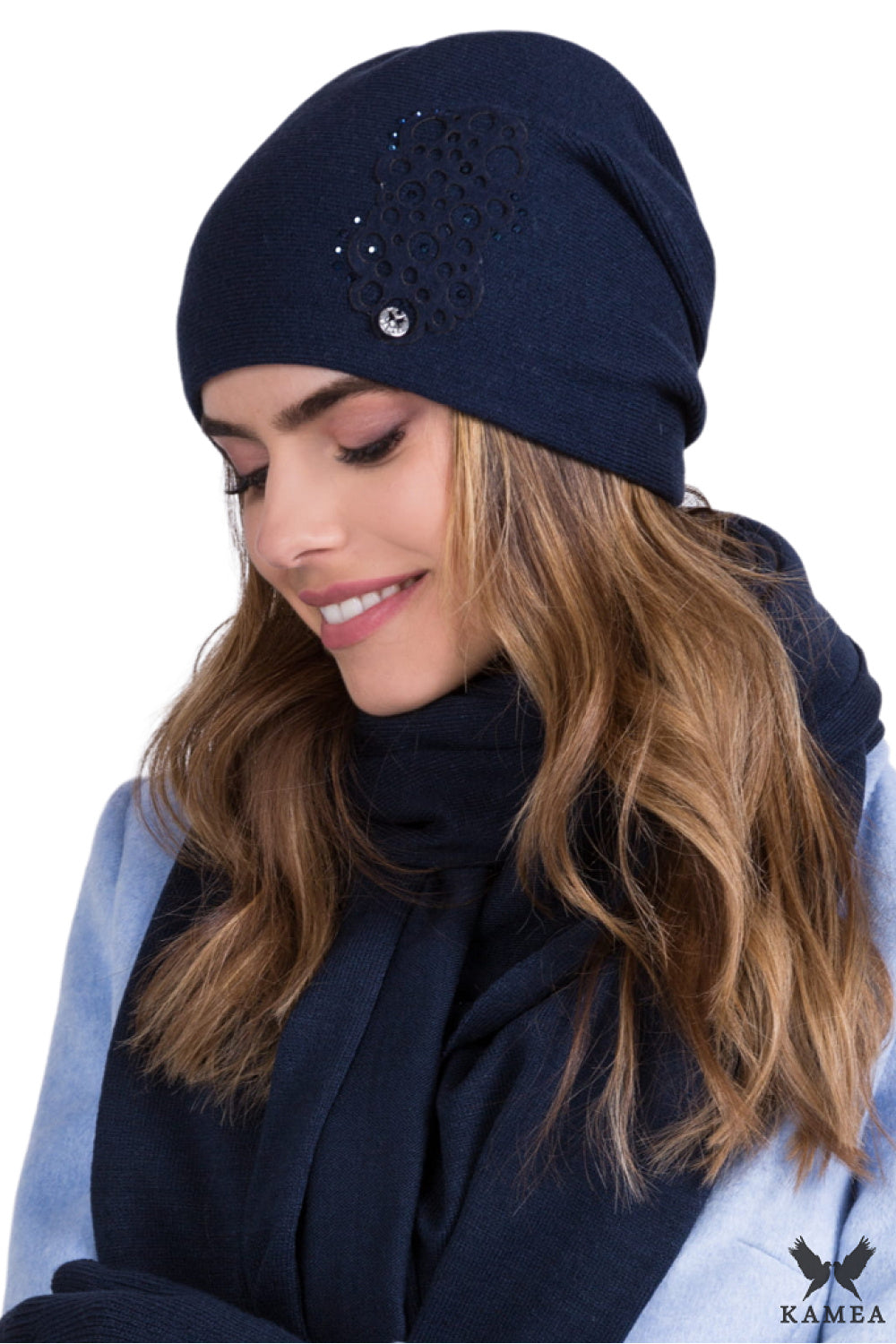 SERENA es un elegante sombrero de mujer en color azul marino que no sólo es elegante, sino también cómodo. Está confeccionado en hilo de alta calidad con un toque de viscosa, lo que lo hace suave y agradable al tacto. Además, está forrado con un cálido forro interior, asegurando calidez en los días más fríos. La forma clásica de este sombrero se complementa con una original aplicación decorada con circonitas, aportando finura y elegancia. En la parte posterior del producto hay pinzas que hacen que el sombrero se ajuste perfectamente a la cabeza. Serena está disponible en muchas variaciones de color, lo que permite combinarla con varios estilos. Es la elección perfecta para las mujeres que valoran la comodidad, la elegancia y el diseño original.