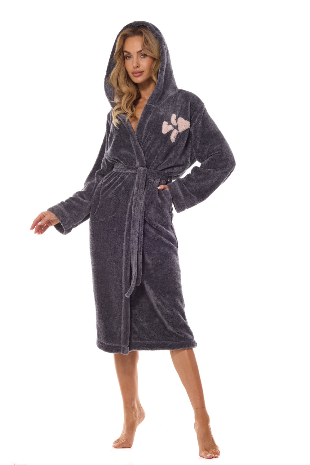 Bata de mujer de corte holgado y cómodo, perfecta para llevar en casa aportando calidez y confort. El modelo llega hasta debajo de la rodilla, tiene prácticos bolsillos a los lados y un cómodo cinturón para anudar, lo que facilita su ajuste a la silueta. Las mangas largas y el material suave garantizan un confort térmico, perfecto para los días más fríos. Tiene una sutil aplicación a la altura del pecho y la parte interior de la capucha está decorada con un acabado elegante, que aporta un carácter único a la bata. Presentado en una elegante bolsa, es una excelente opción tanto para usted como para regalar. Producto polaco, elaborado con atención a cada detalle.
